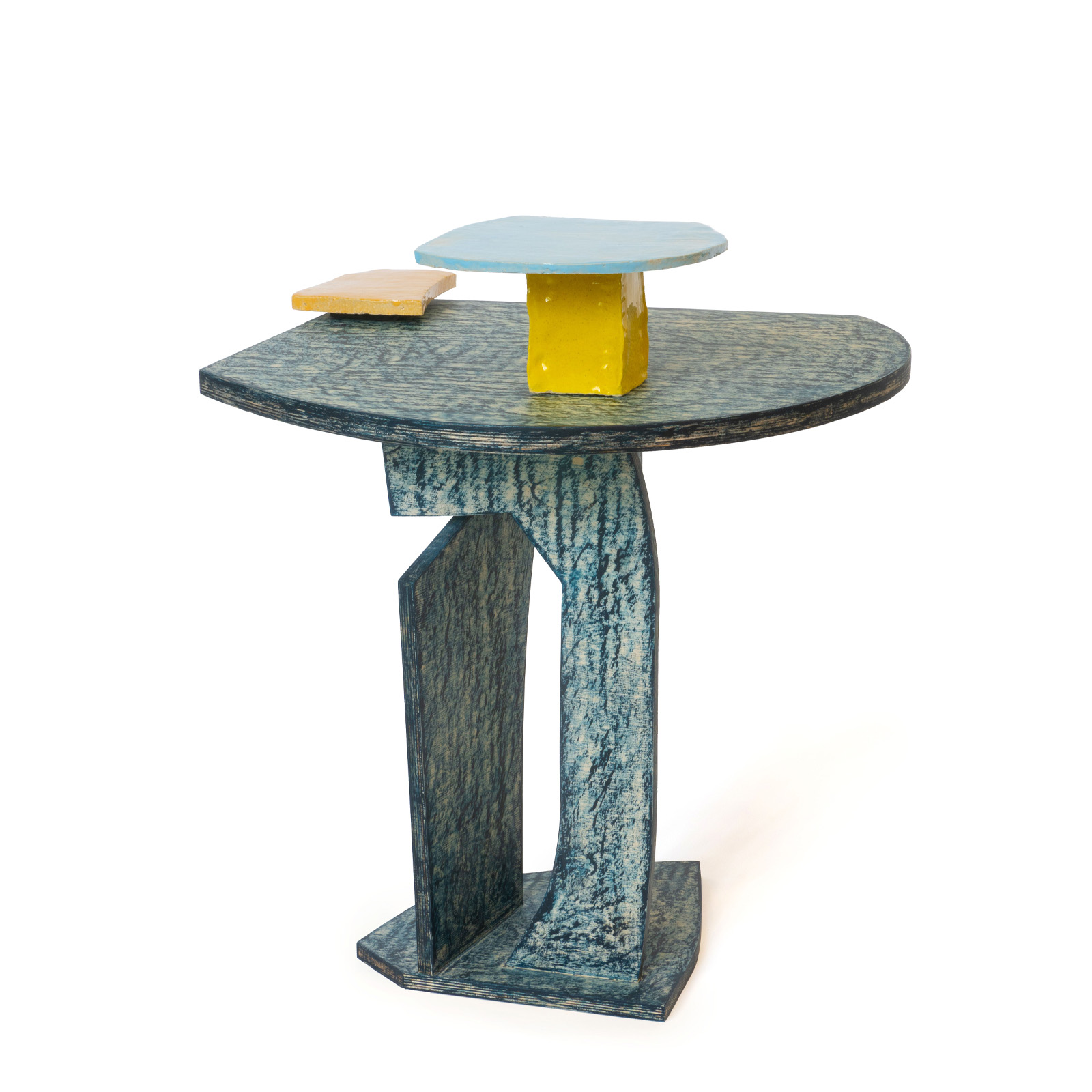This object is made of wood and stoneware in Kiki’s atelier. Kiki applies a unique finish onto the wood by chalking the entire object by hand with wax crayons. She does this with a very strong and determined signature. It is then covered with several layers of varnish. She builds the clay parts playfully from slab clay stoneware. She cuts the clay by hand and glazes it with a brush. Each piece is unique, handmade, so no two items are exactly alike.
