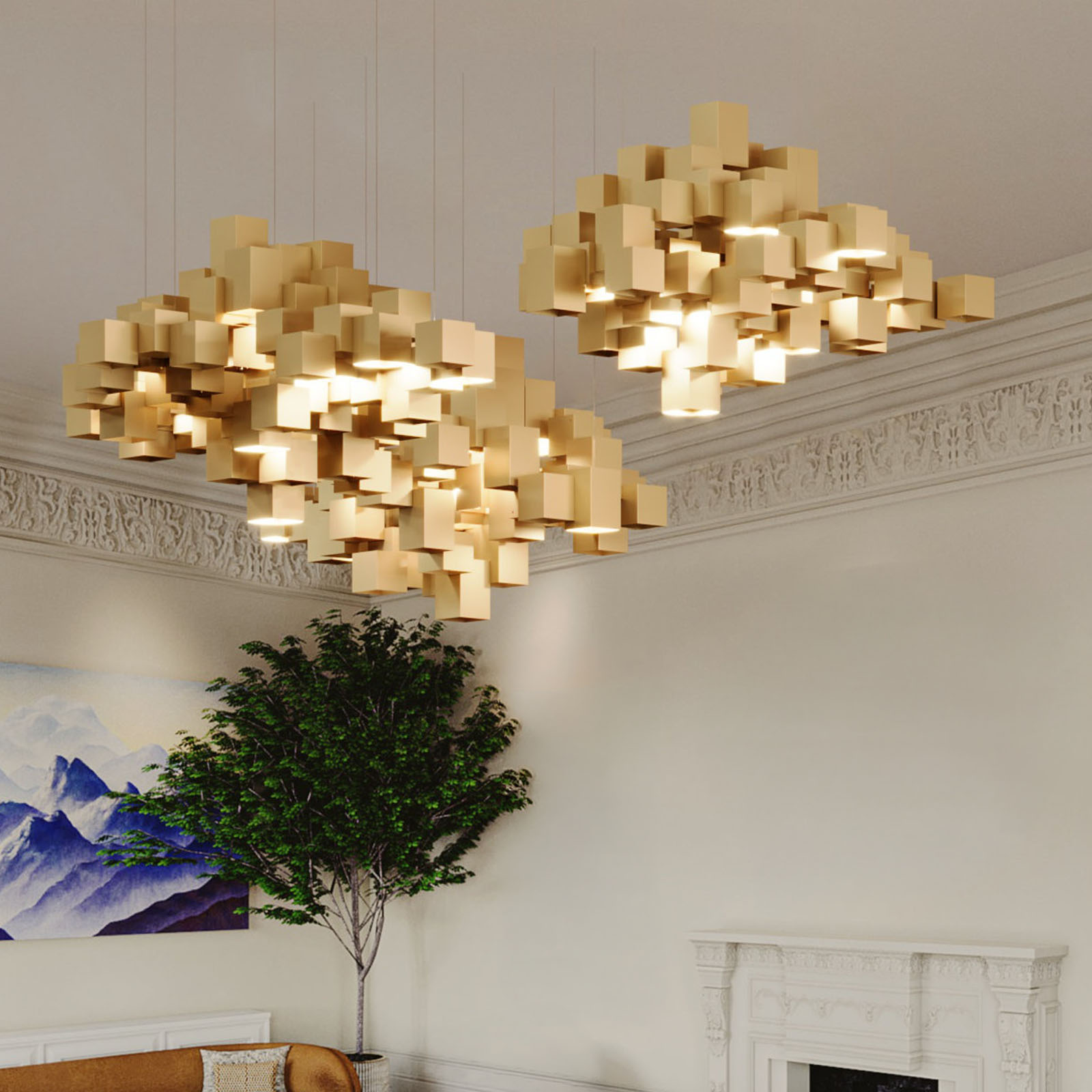 Originally designed by HP Sommer, the Brass Cubes Chandelier Collection takes inspiration from the cloud’s shape and is converted in a kind of pixel. This new configuration is realized for circular and concentrical space.