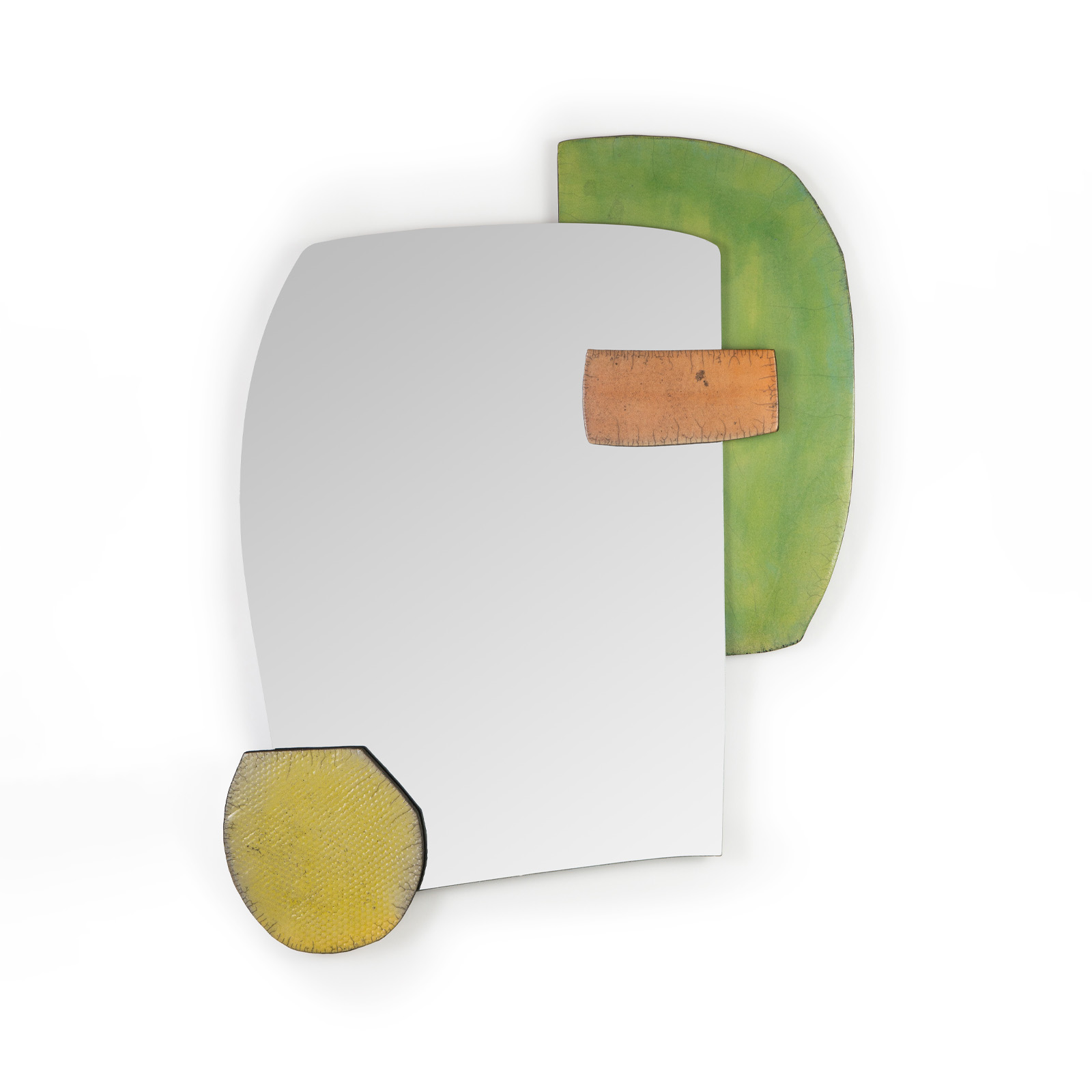 These wall-objects made in ceramics are inspired by Kiki’s cardboard collages. “I’m playfully building with clay pieces. I cut the raku clay by hand and I glaze it with a brush, adding a mirror here and there while finding a new interpretation of ceramic wall panels.”