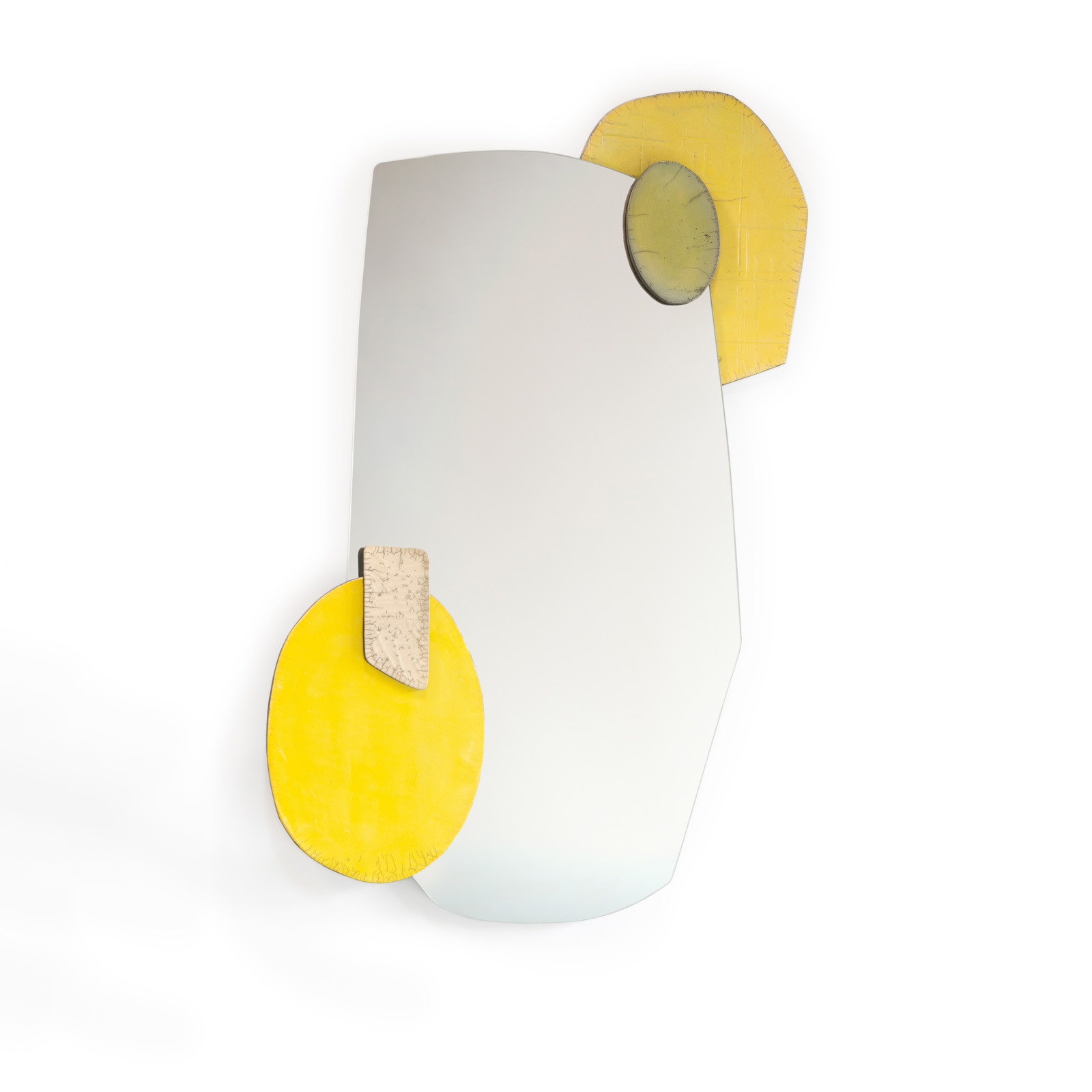 These wall-objects made in ceramics are inspired by Kiki’s cardboard collages. “I’m playfully building with clay pieces. I cut the raku clay by hand and I glaze it with a brush, adding a mirror here and there while finding a new interpretation of ceramic wall panels.”