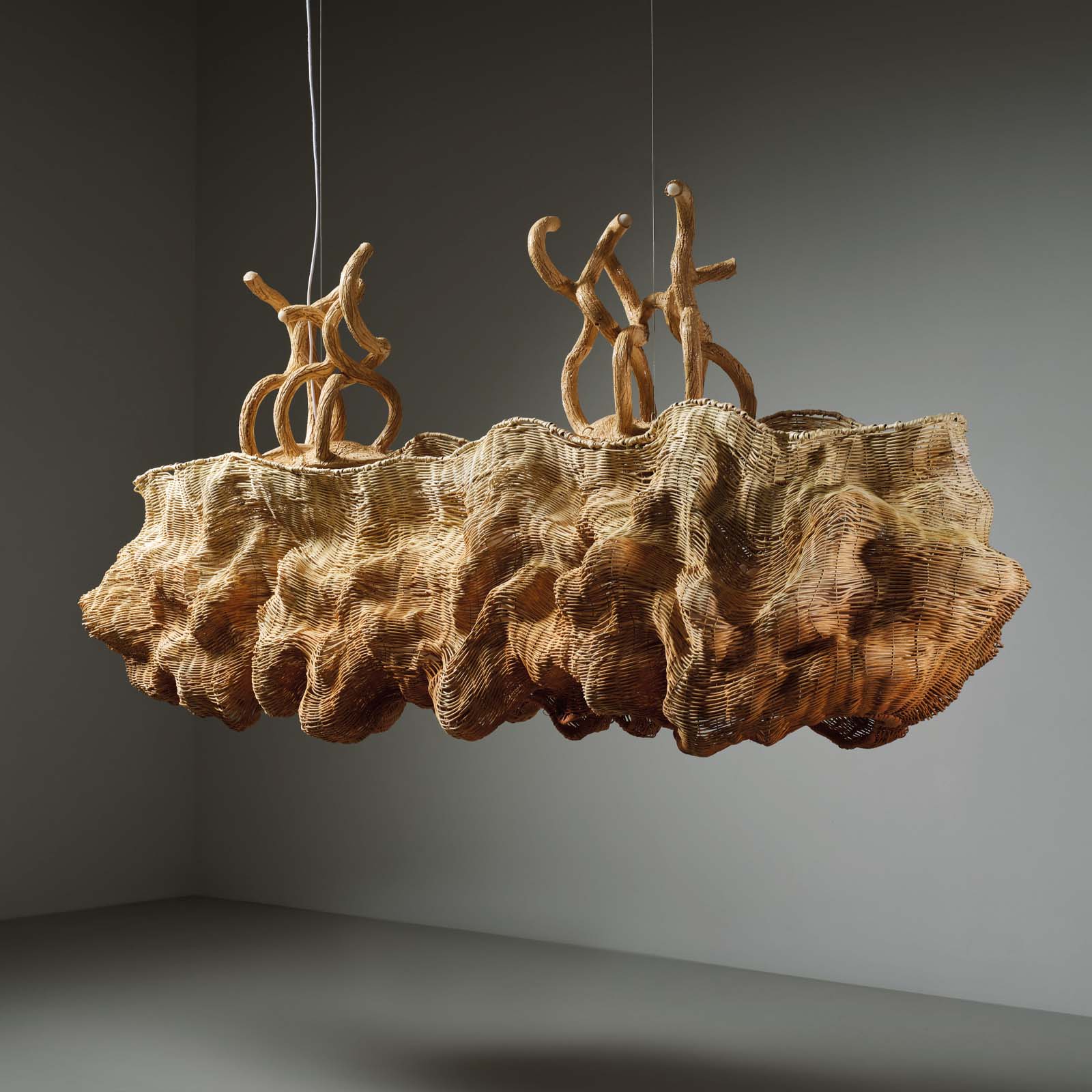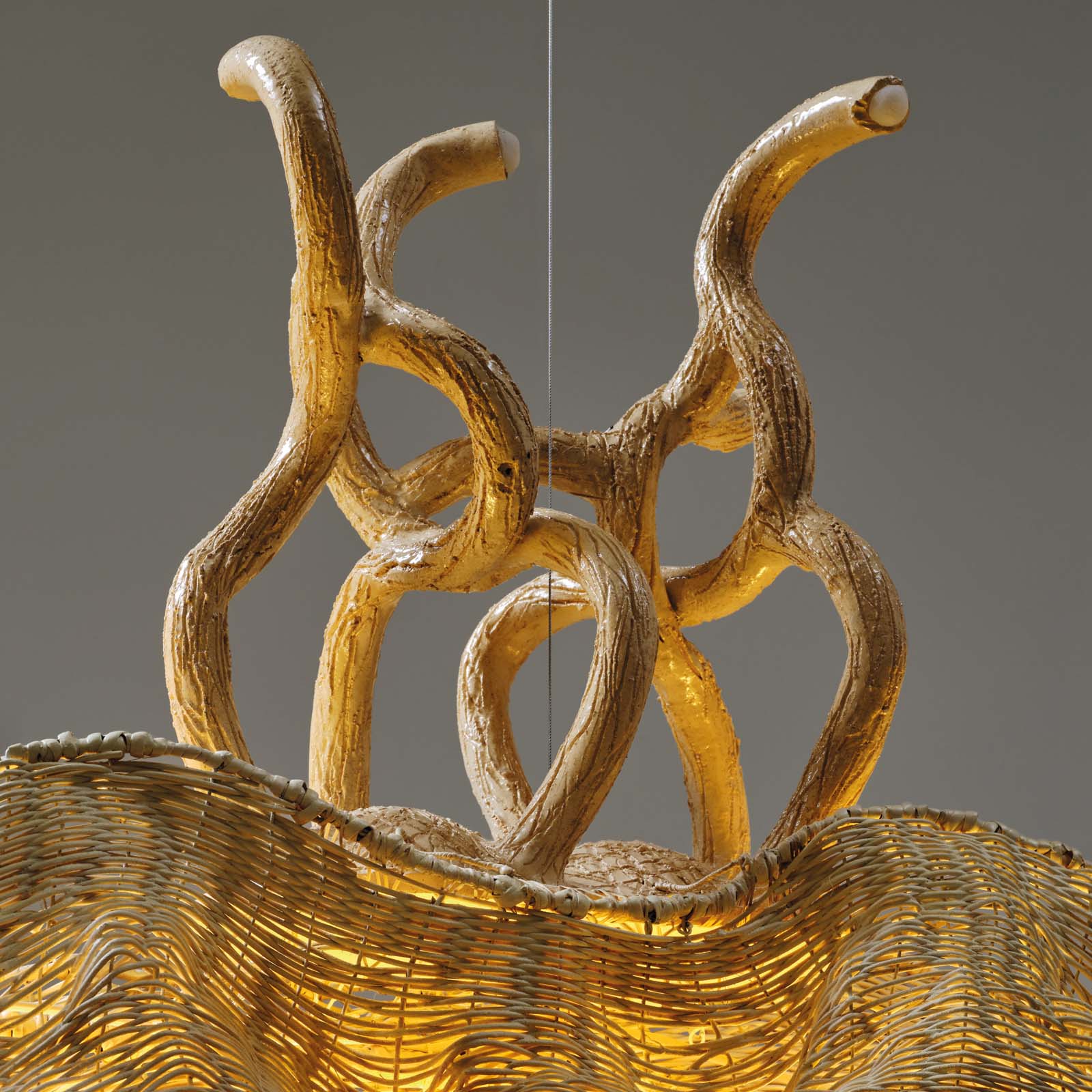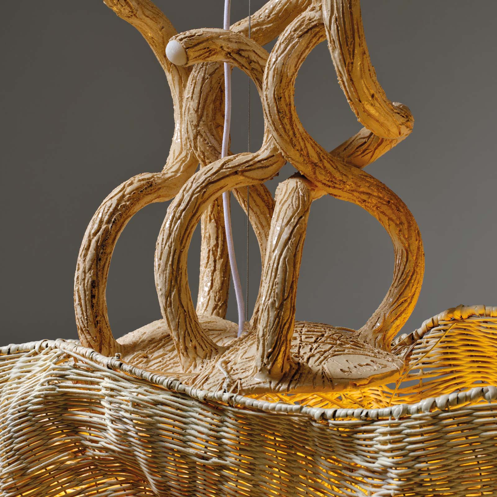 One-of-a-kind lighting object that combines ceramic extrusion, metal wires and rattan weaving. Rattan is a living and sinuous plant material that allows to weave surfaces around the light like a skin containing it. At the heart of the chandelier lies a diffuse energy and luminous light.