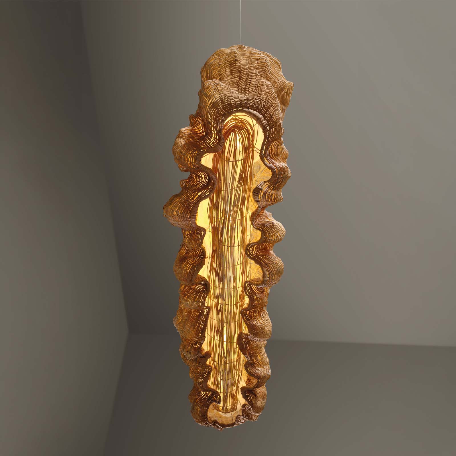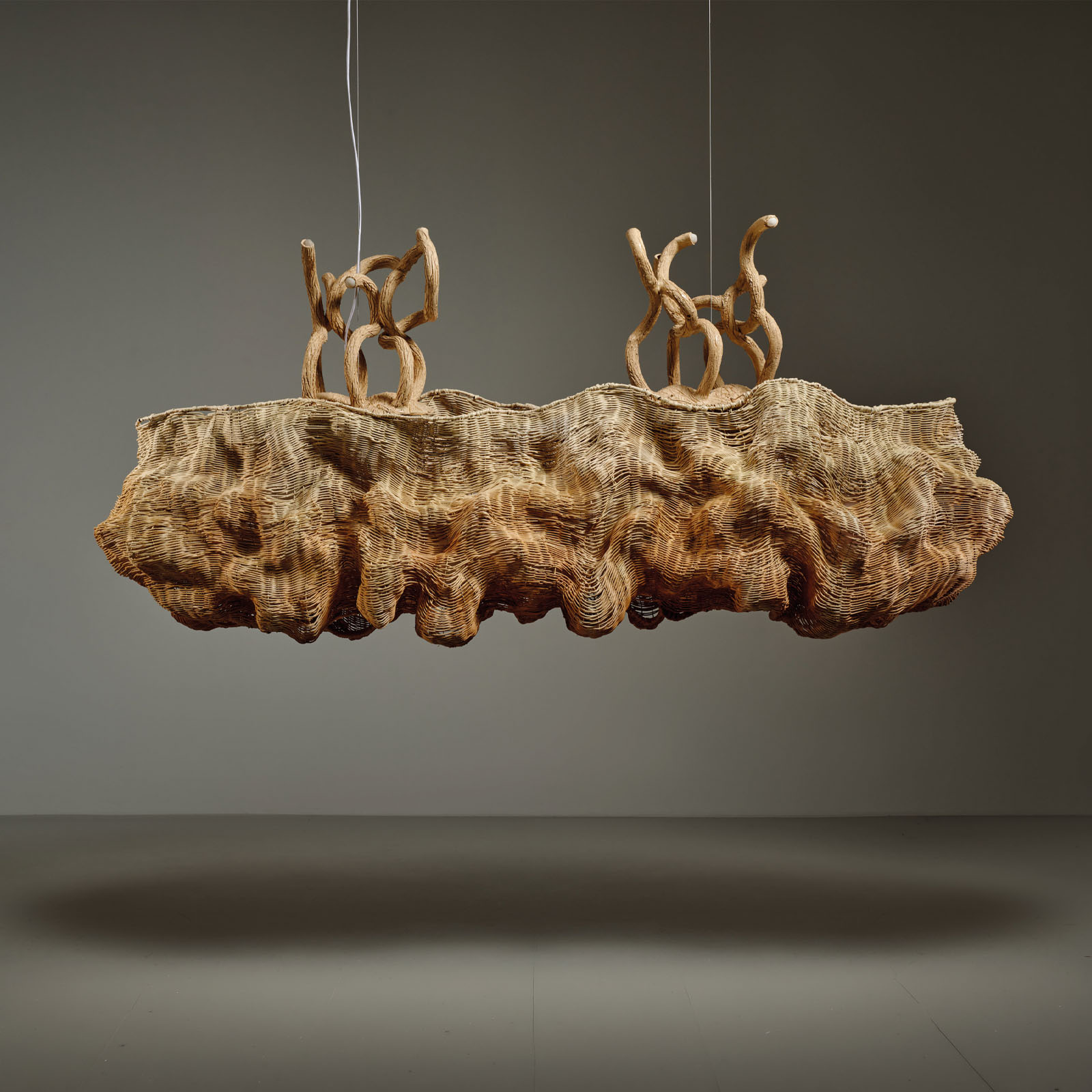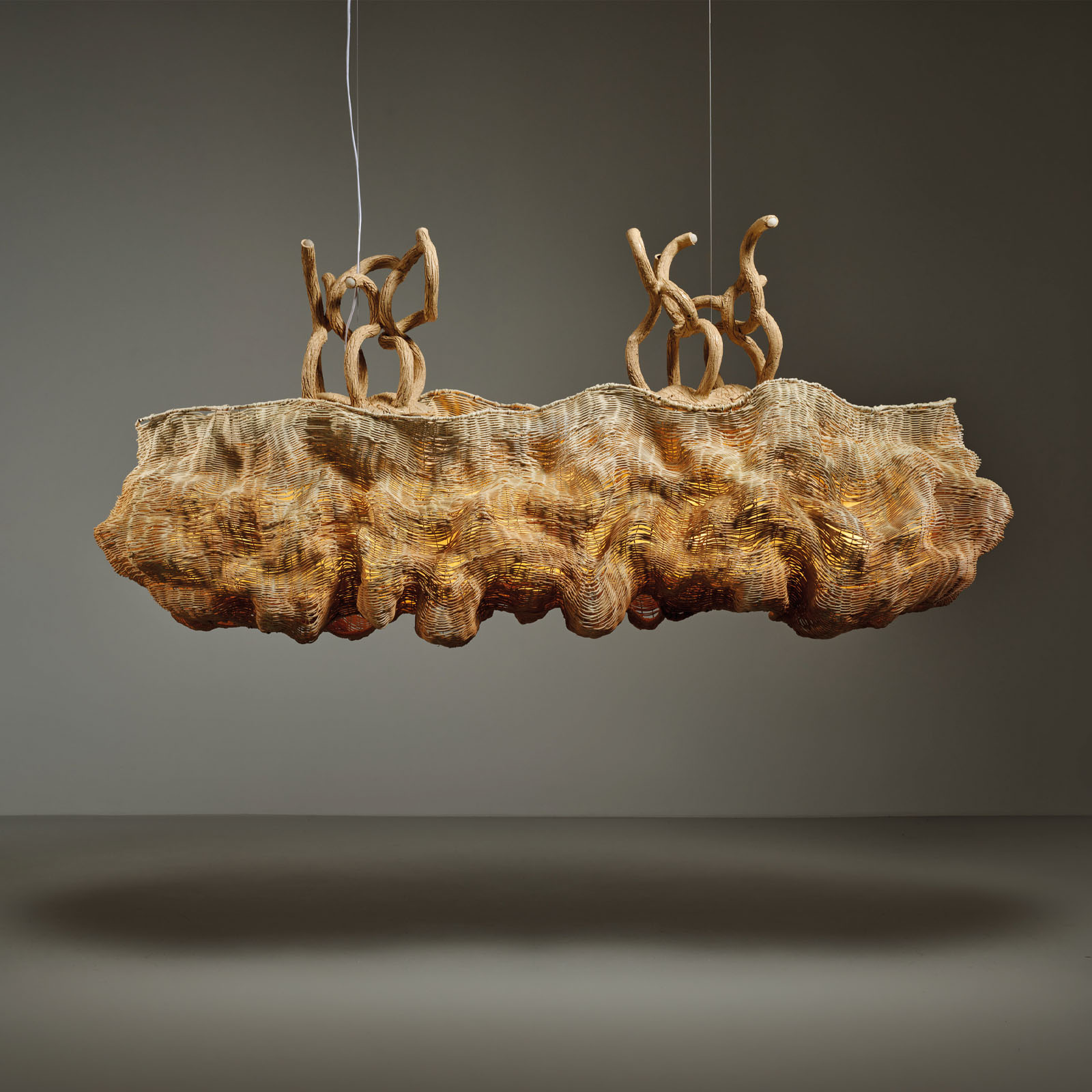 One-of-a-kind lighting object that combines ceramic extrusion, metal wires and rattan weaving. Rattan is a living and sinuous plant material that allows to weave surfaces around the light like a skin containing it. At the heart of the chandelier lies a diffuse energy and luminous light.