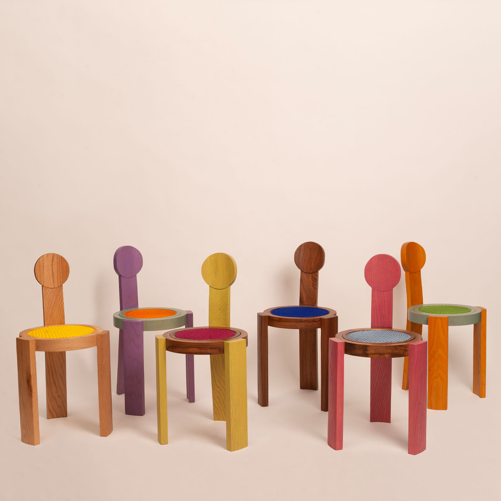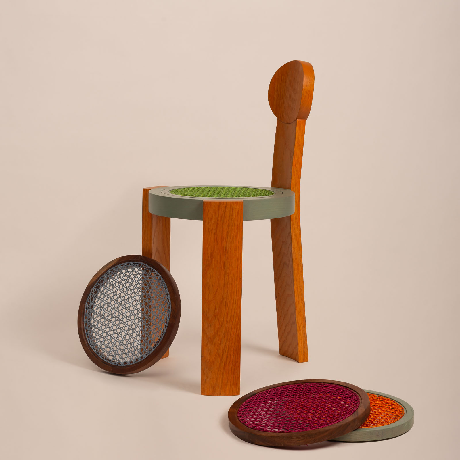 Featuring a stackable chair model with interchangeable seats, offering textile or woven options. Blending mexican artisanal techniques with carpentry, we inject a playful twist into craftsmanship, handcrafting each piece. We innovate by incorporating nylon thread into traditional cane weaving,enhancing durability and color vibrancy. Embracing experimentation with color, our chairs adapt to any palette, offering endless possibilities.