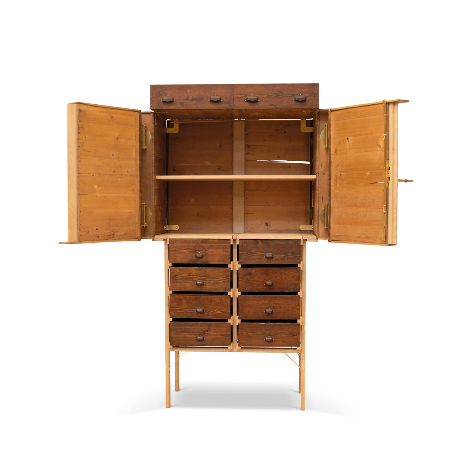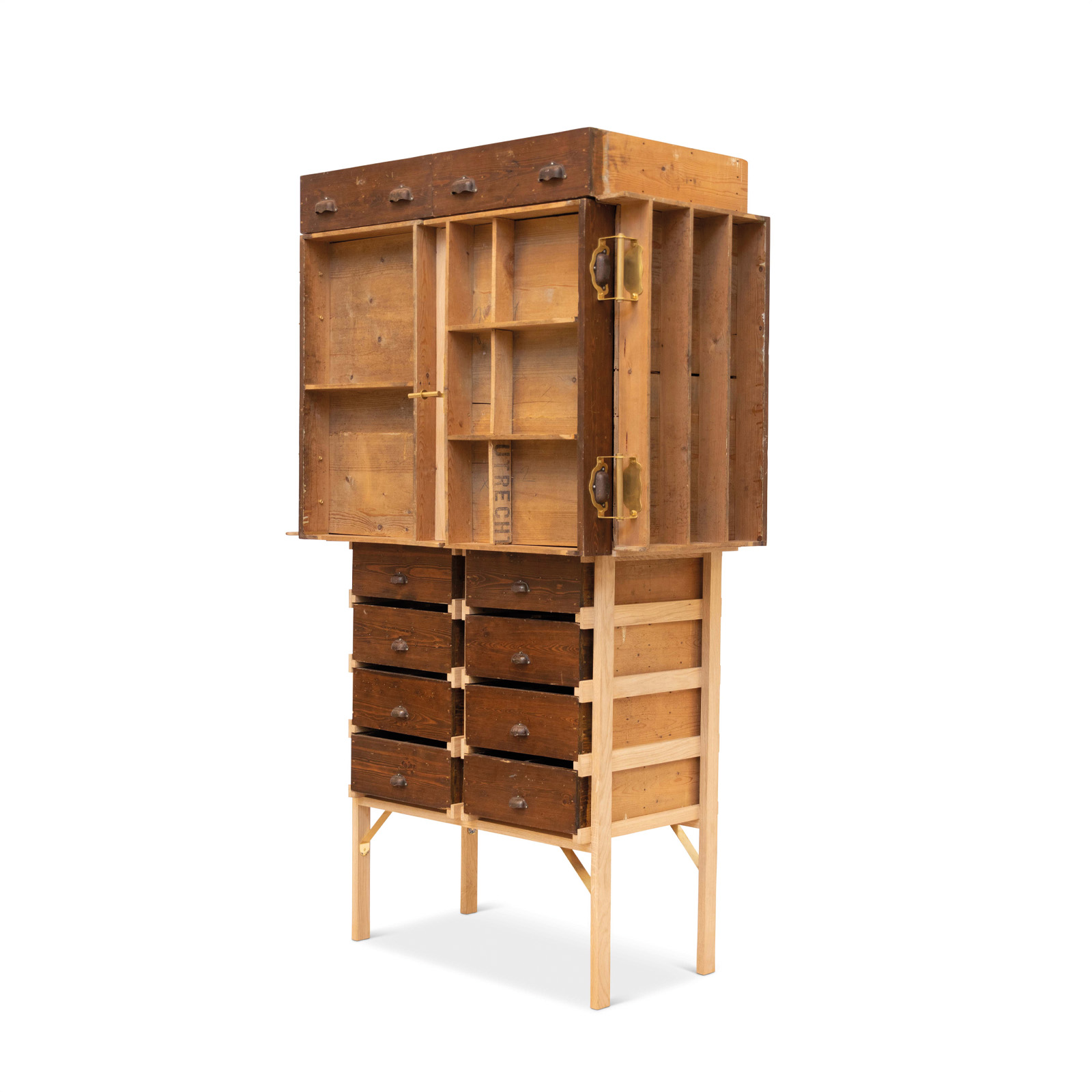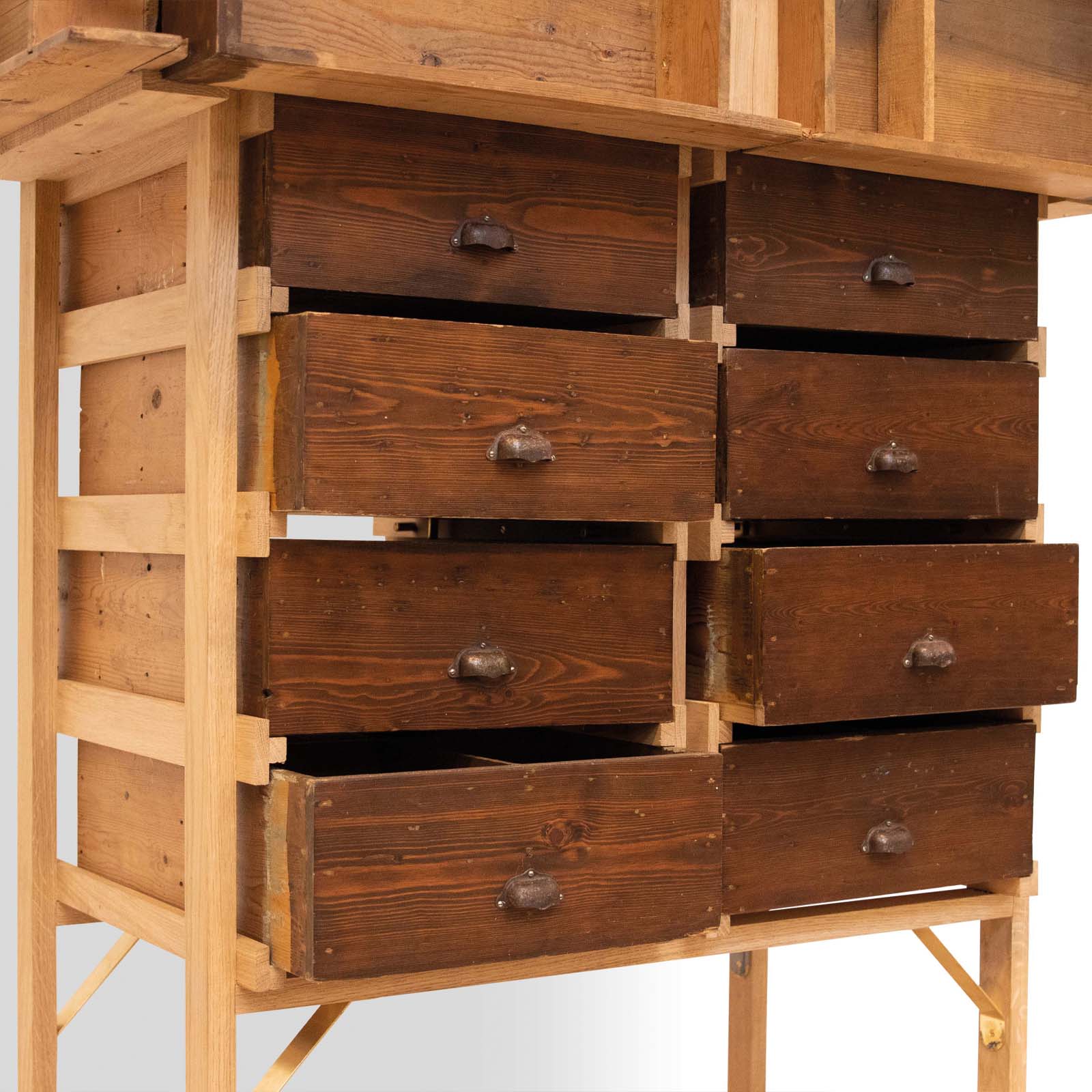 A large, solid piece of furniture with a layout similar to a classic cabinet (three drawers below and two doors above). The cabinet is made from drawers used in unconventional ways: a drawer can function as a door or a side panel, but in this case also as a drawer. The structure is made of oak, with brass hinges and fittings. The whole—cabinet, brown drawers, oak, and brass—has an “improper classical technical character.”