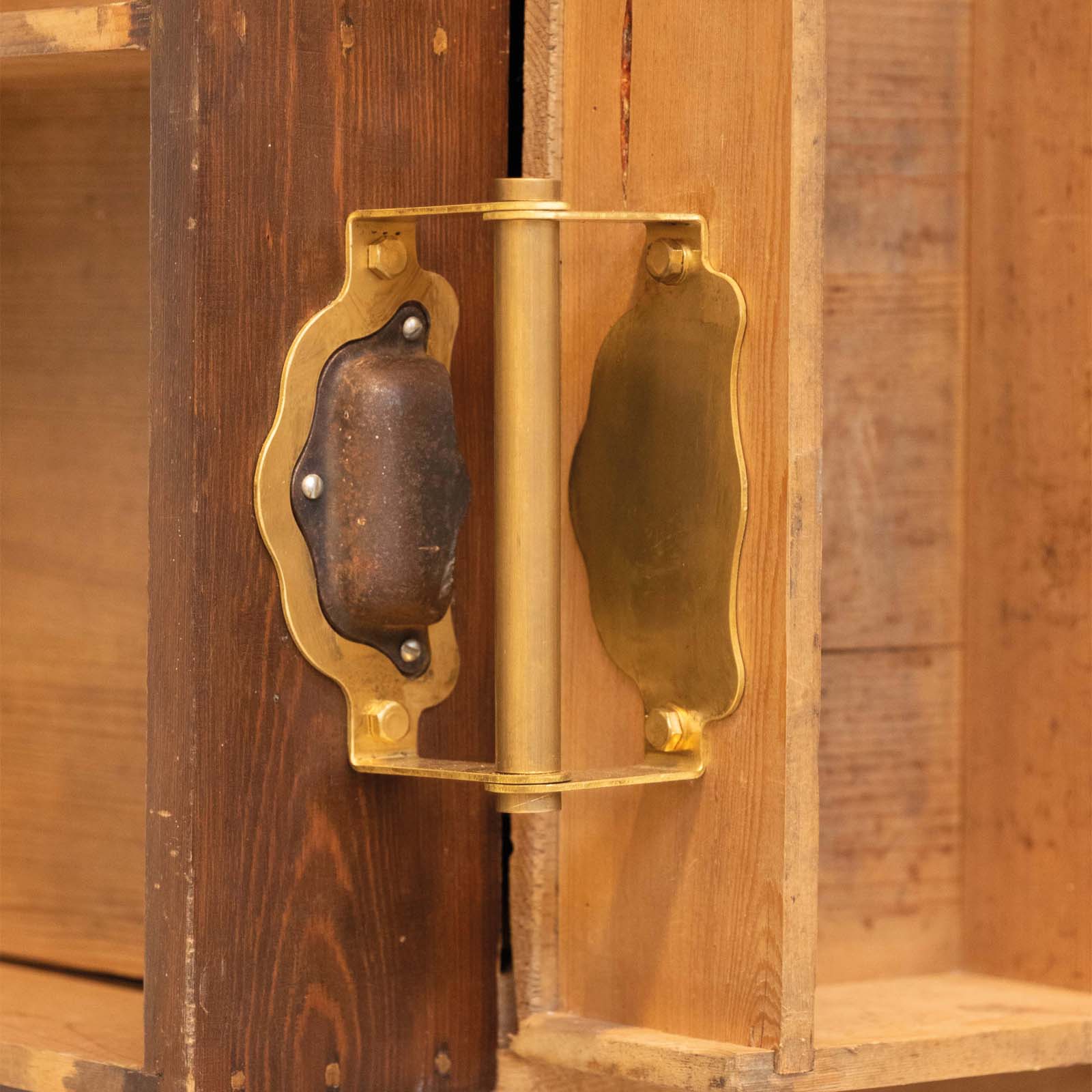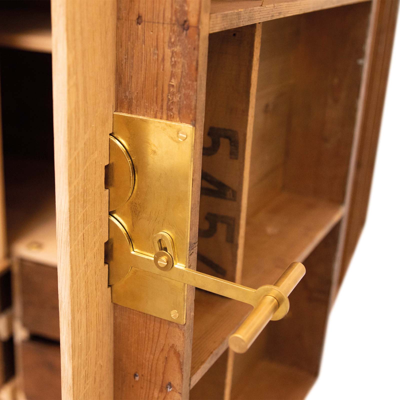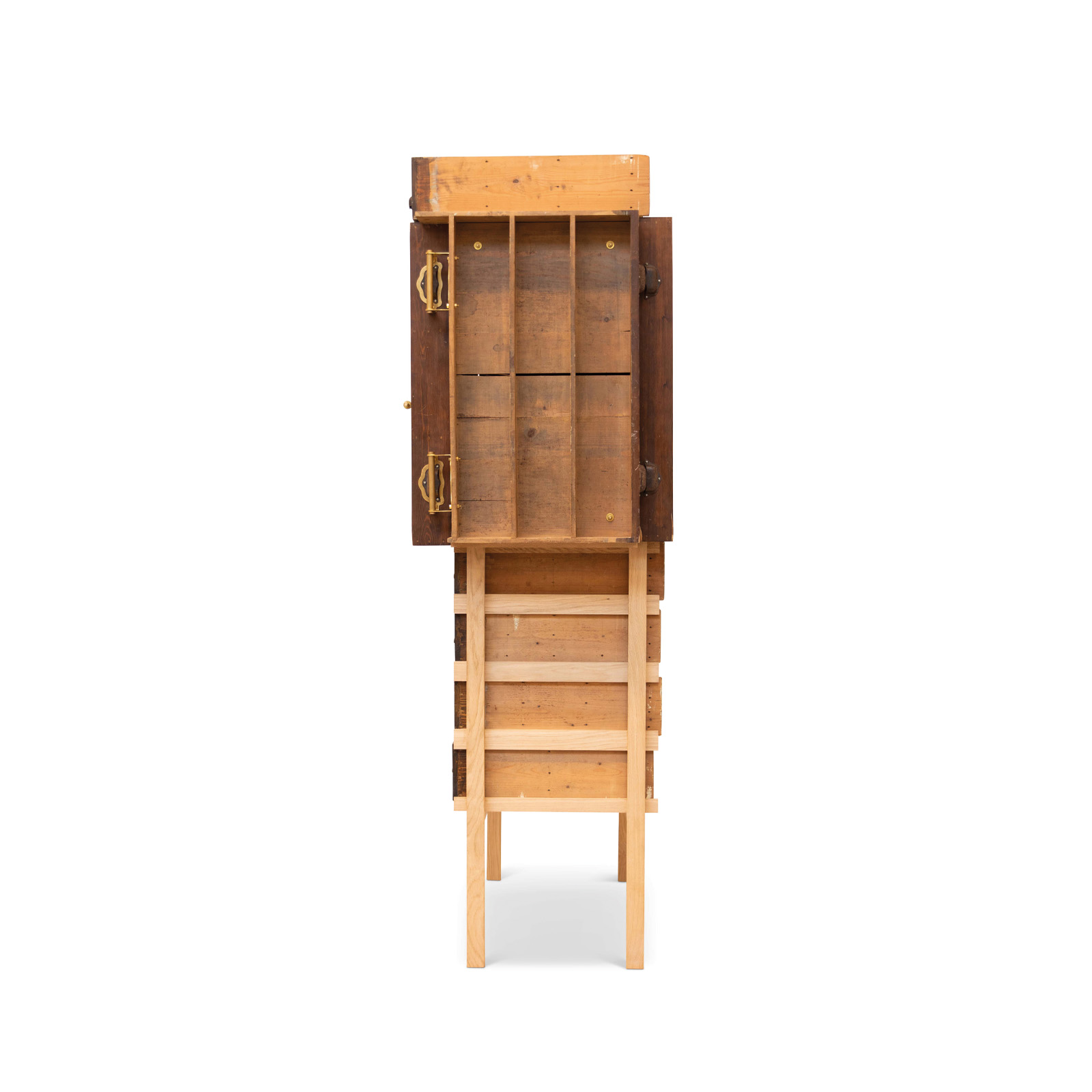 A large, solid piece of furniture with a layout similar to a classic cabinet (three drawers below and two doors above). The cabinet is made from drawers used in unconventional ways: a drawer can function as a door or a side panel, but in this case also as a drawer. The structure is made of oak, with brass hinges and fittings. The whole—cabinet, brown drawers, oak, and brass—has an “improper classical technical character.”