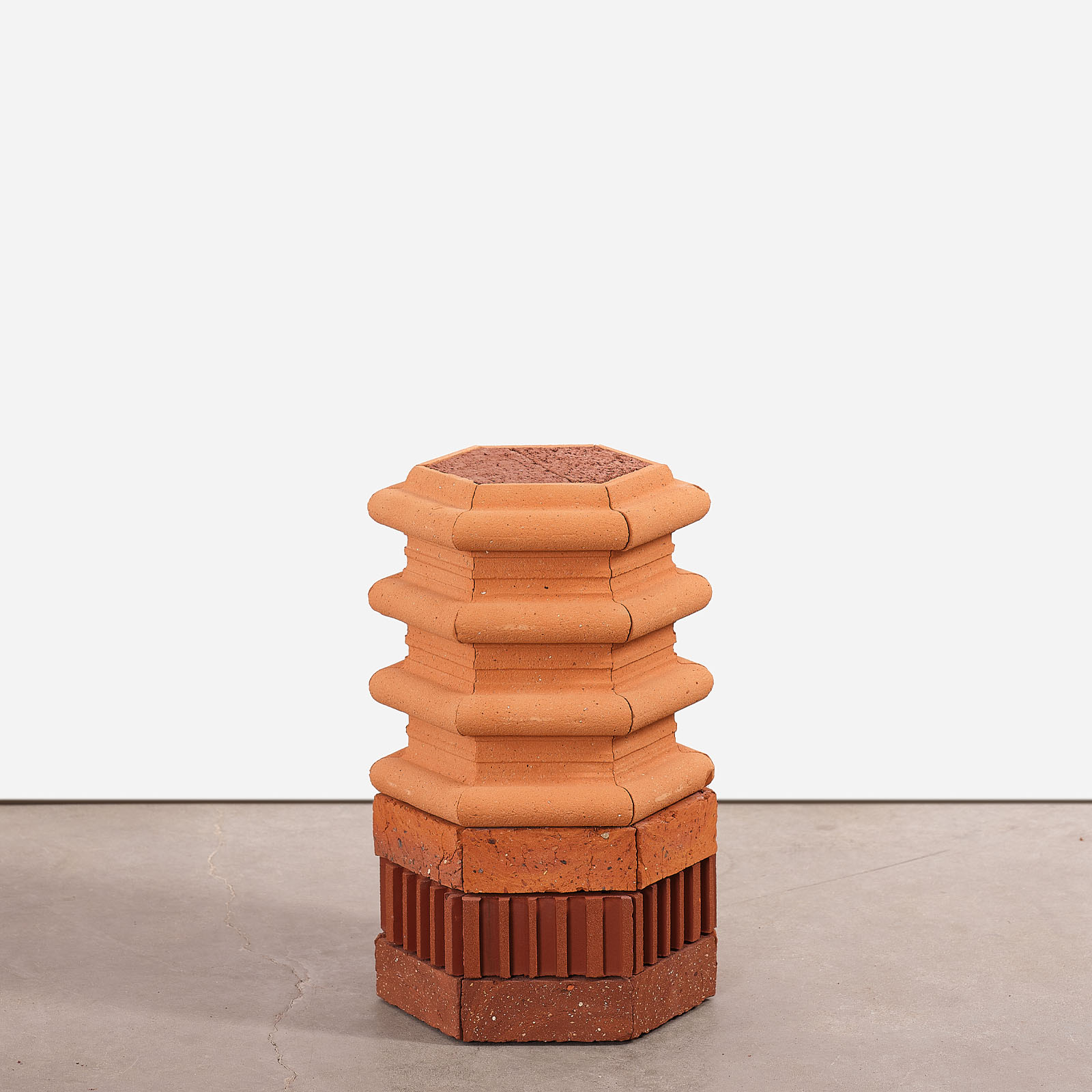 Bricks are made of earth but they are industrially produced and nowadays they symbolize a society which has been driven continuously by money and productivity. Highlighting their subtile colors, their extensive textures and their graphical qualities, Aurélien Veyrat resets our vision : while looking at his columns or sculptures of repeated elements, we feel a confrontation between past and future, between low- and high-technology, between industry and craft. As an archeologist, Aurélien Veyrat keeps, classifies, archives all the precious wastes he creates by sculpting bricks. This parts inspires him new shapes and new associations. As far as his wastes go smaller, he has a new challenge. Questioning the relation between decor and construction, with common elements we never care about, he develops his own imaginary spaces and let the visitors interpret scales and combinaisons in their own ways. We can be moved by the beauty of these ruins while our world seems so troubled.