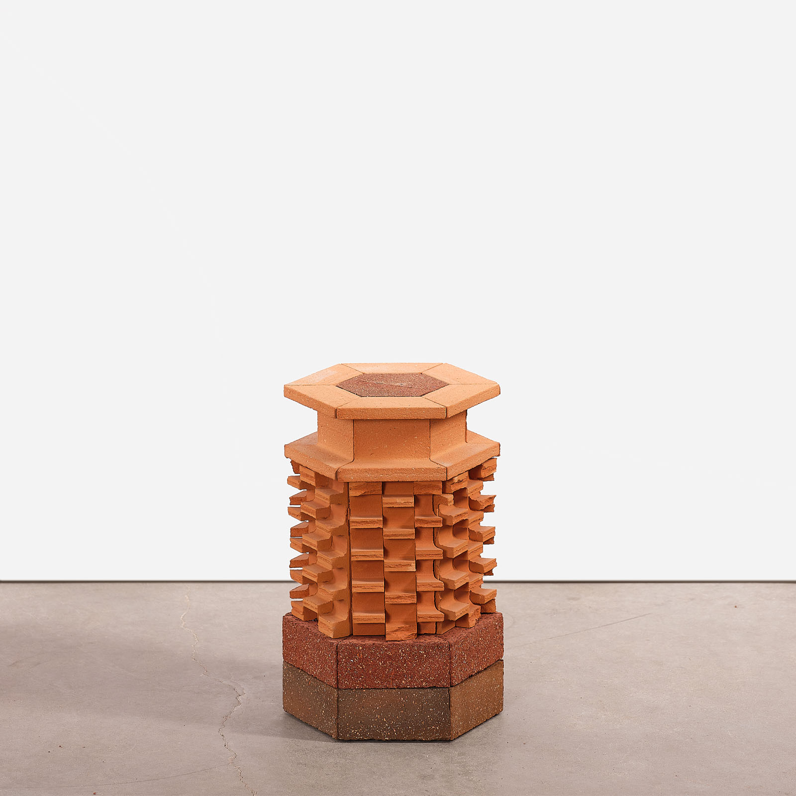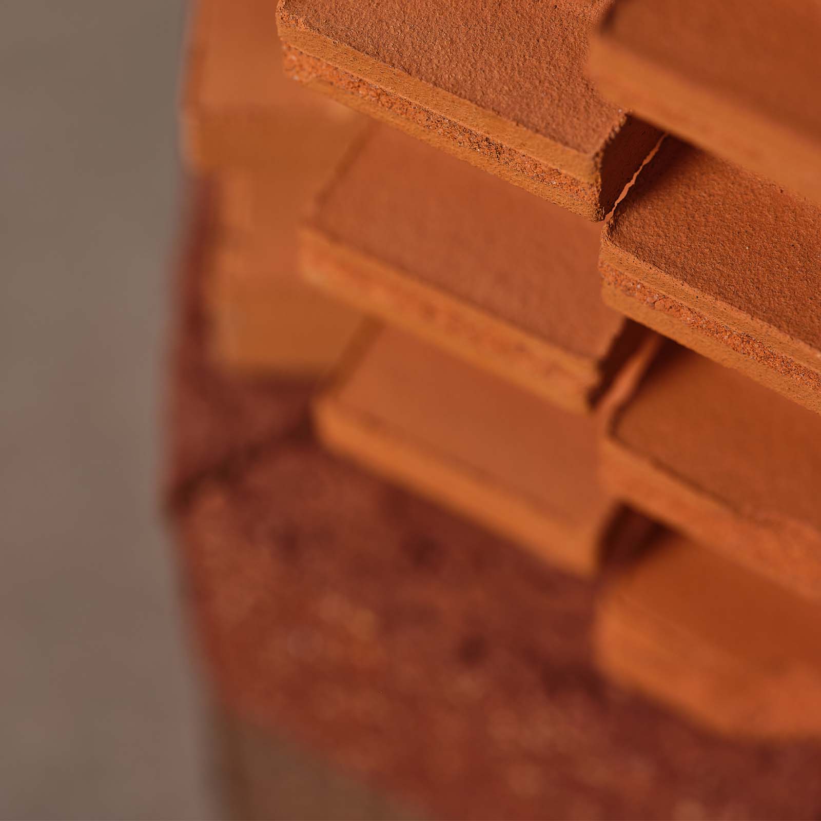 Bricks are made of earth but they are industrially produced and nowadays they symbolize a society which has been driven continuously by money and productivity. Highlighting their subtile colors, their extensive textures and their graphical qualities, Aurélien Veyrat resets our vision : while looking at his columns or sculptures of repeated elements, we feel a confrontation between past and future, between low- and high-technology, between industry and craft. As an archeologist, Aurélien Veyrat keeps, classifies, archives all the precious wastes he creates by sculpting bricks. This parts inspires him new shapes and new associations. As far as his wastes go smaller, he has a new challenge. Questioning the relation between decor and construction, with common elements we never care about, he develops his own imaginary spaces and let the visitors interpret scales and combinaisons in their own ways. We can be moved by the beauty of these ruins while our world seems so troubled.