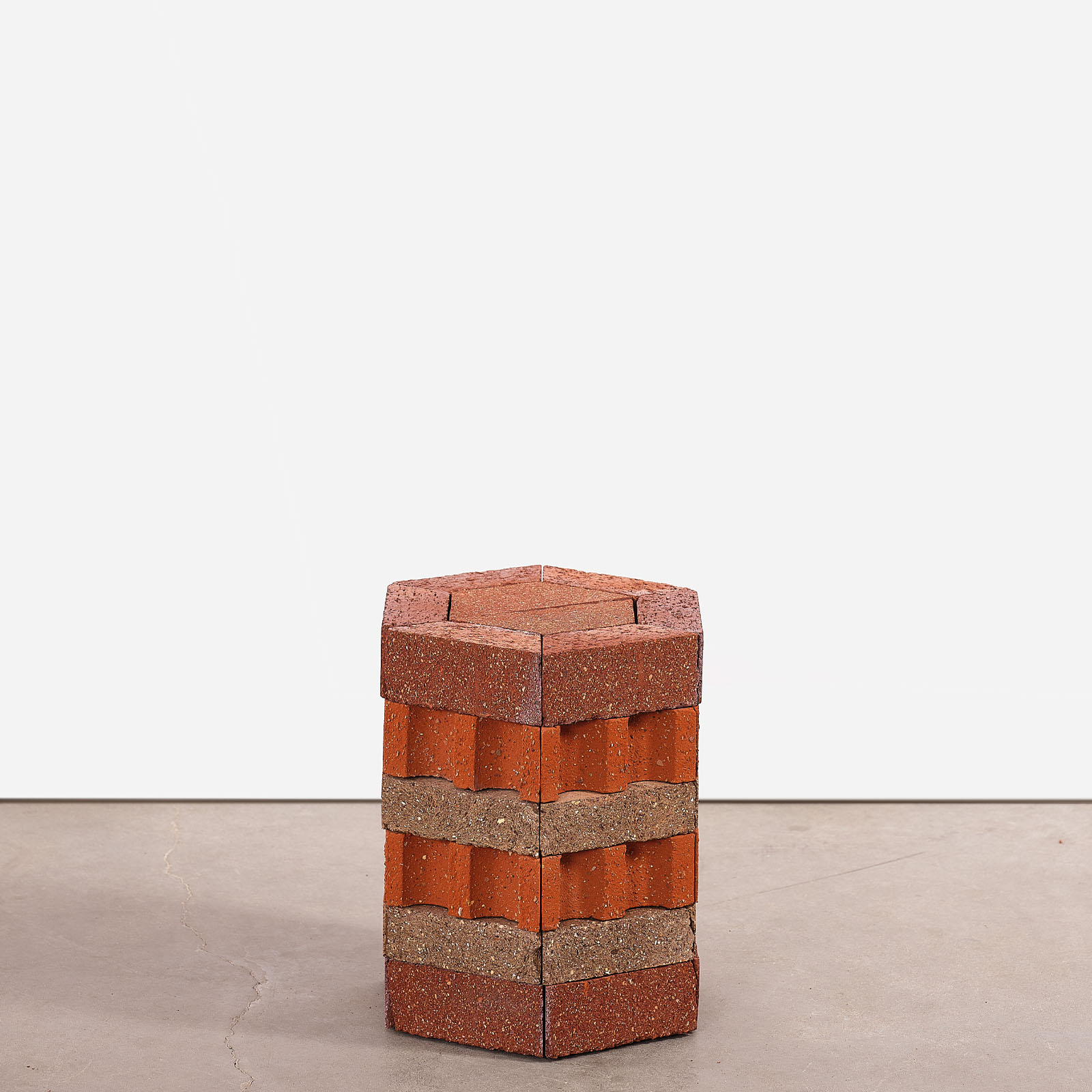 Bricks are made of earth but they are industrially produced and nowadays they symbolize a society which has been driven continuously by money and productivity. Highlighting their subtile colors, their extensive textures and their graphical qualities, Aurélien Veyrat resets our vision : while looking at his columns or sculptures of repeated elements, we feel a confrontation between past and future, between low- and high-technology, between industry and craft. As an archeologist, Aurélien Veyrat keeps, classifies, archives all the precious wastes he creates by sculpting bricks. This parts inspires him new shapes and new associations. As far as his wastes go smaller, he has a new challenge. Questioning the relation between decor and construction, with common elements we never care about, he develops his own imaginary spaces and let the visitors interpret scales and combinaisons in their own ways. We can be moved by the beauty of these ruins while our world seems so troubled.