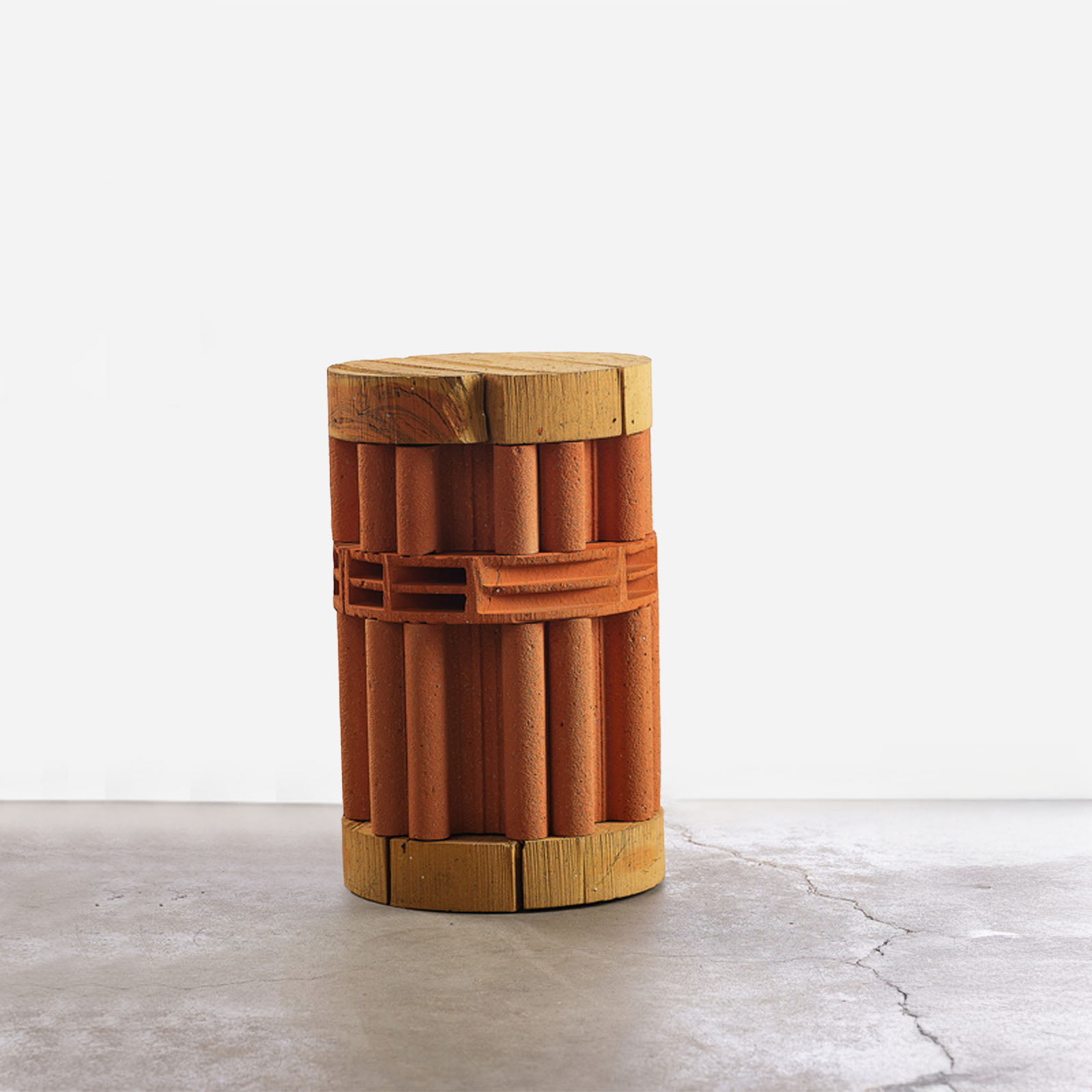 ricks are made of earth but they are industrially produced and nowadays they symbolize a society which has been driven continuously by money and productivity. Highlighting their subtile colors, their extensive textures and their graphical qualities, Aurélien Veyrat resets our vision : while looking at his columns or sculptures of repeated elements, we feel a confrontation between past and future, between low- and high-technology, between industry and craft. As an archeologist, Aurélien Veyrat keeps, classifies, archives all the precious wastes he creates by sculpting bricks. This parts inspires him new shapes and new associations. As far as his wastes go smaller, he has a new challenge. Questioning the relation between decor and construction, with common elements we never care about, he develops his own imaginary spaces and let the visitors interpret scales and combinaisons in their own ways. We can be moved by the beauty of these ruins while our world seems so troubled.