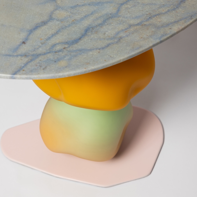 The key glass components that define the visual of experience are hand shaped, created with a traditional technique that allows for two or more colours to create a continuous transition. The steel structure likewise echoes the world of nature and, just like the glass, takes a rounded organic form. The table tops come in two variants to choose from, either stone or glass.