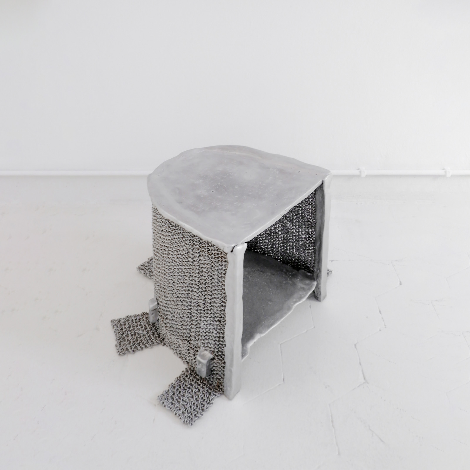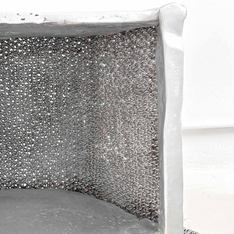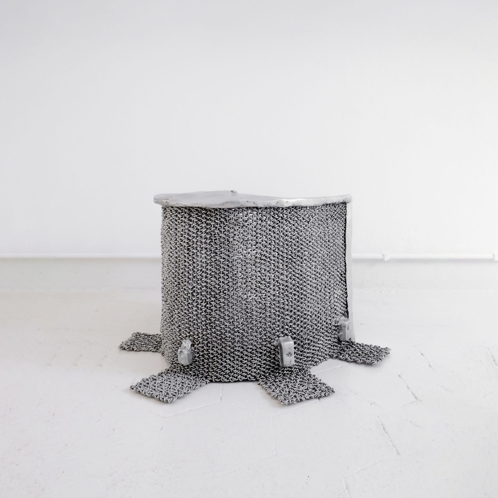 The Fuzzy-5 table is part of the Fuzzy collection by Nicolas Zanoni. This table is crafted using a handwoven aluminum mesh, which is then cast in sand-cast aluminum. During the casting process, the molten metal infiltrates the mesh, integrating it as a structural element without the need for welding. The result is a refined piece, where material and process define the function.