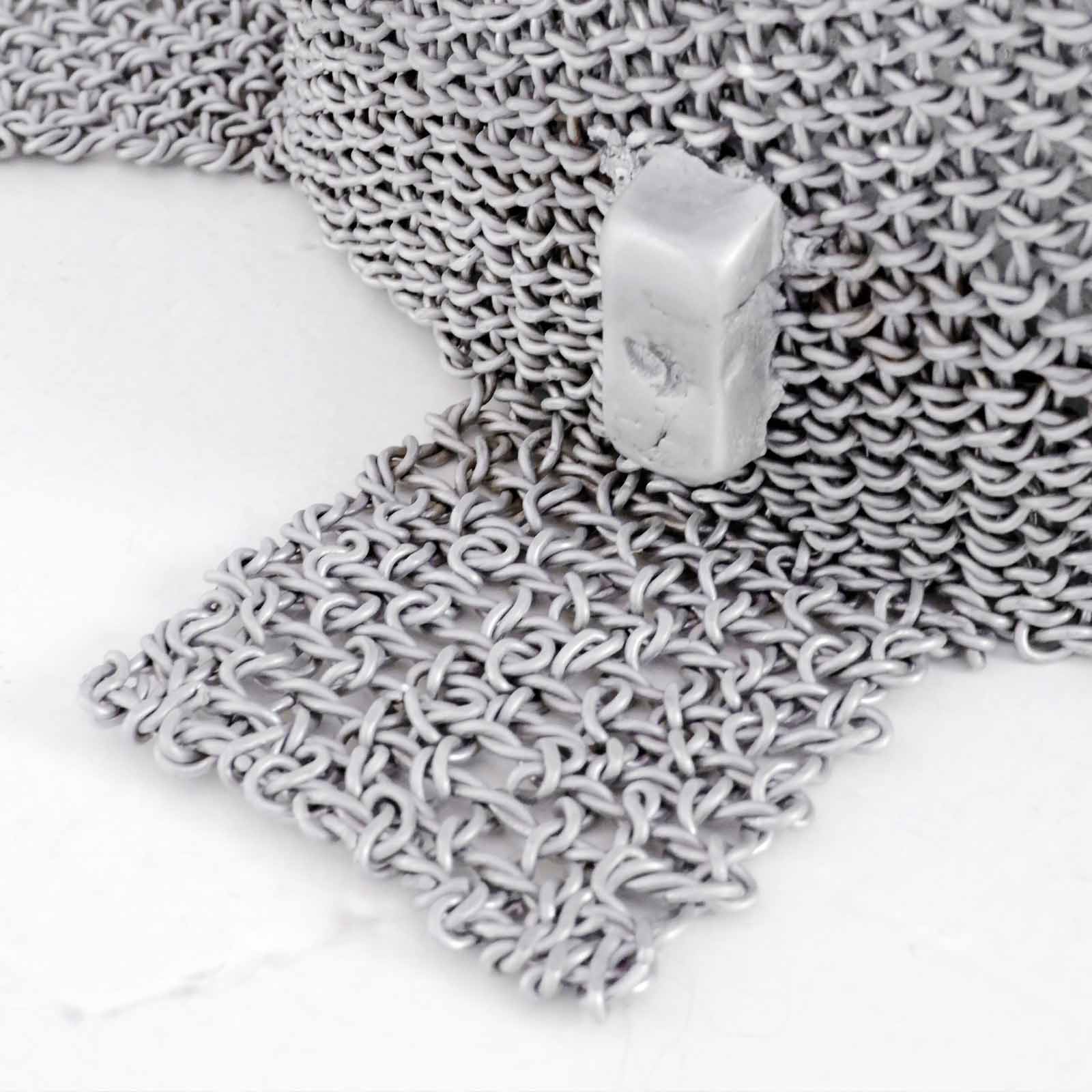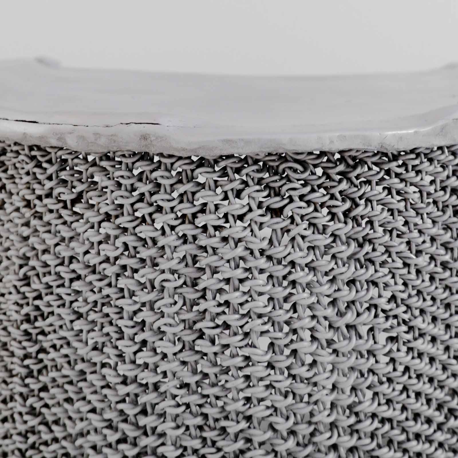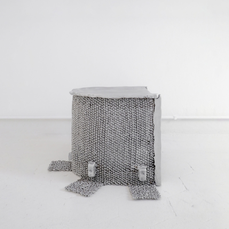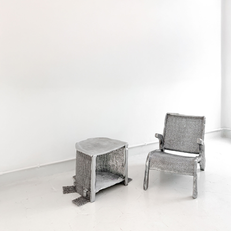 The Fuzzy-5 table is part of the Fuzzy collection by Nicolas Zanoni. This table is crafted using a handwoven aluminum mesh, which is then cast in sand-cast aluminum. During the casting process, the molten metal infiltrates the mesh, integrating it as a structural element without the need for welding. The result is a refined piece, where material and process define the function.