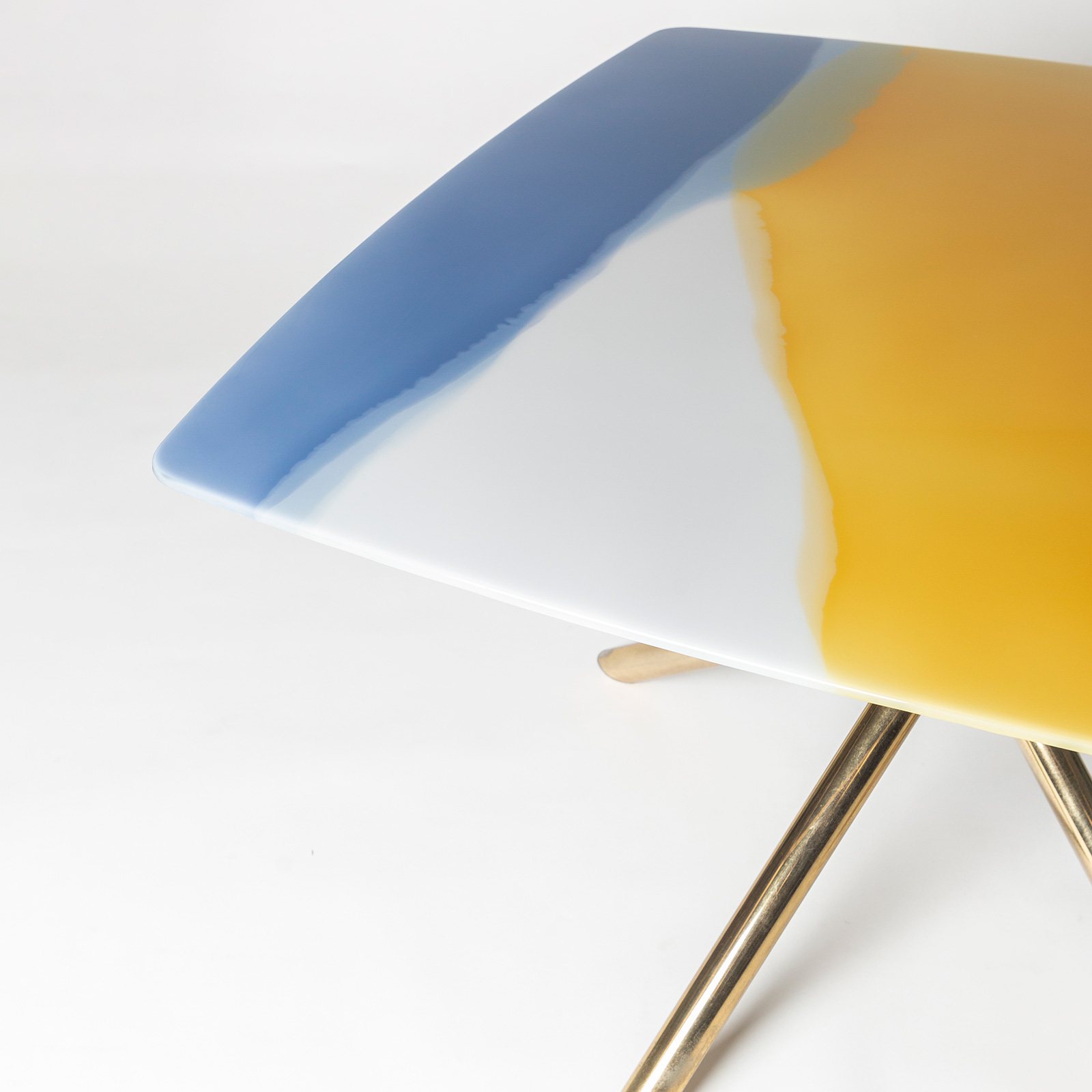 Color, experimentation and light. This artistic design table expresses all the uniqueness of the Draga & Aurel style. Delicate shades of soft colors, made by hand with the use of resin, enhance the top. The glossy surface reflects the outside world and plays with light. The soft shapes and the faceted and organic edges make the table elegant and balanced.