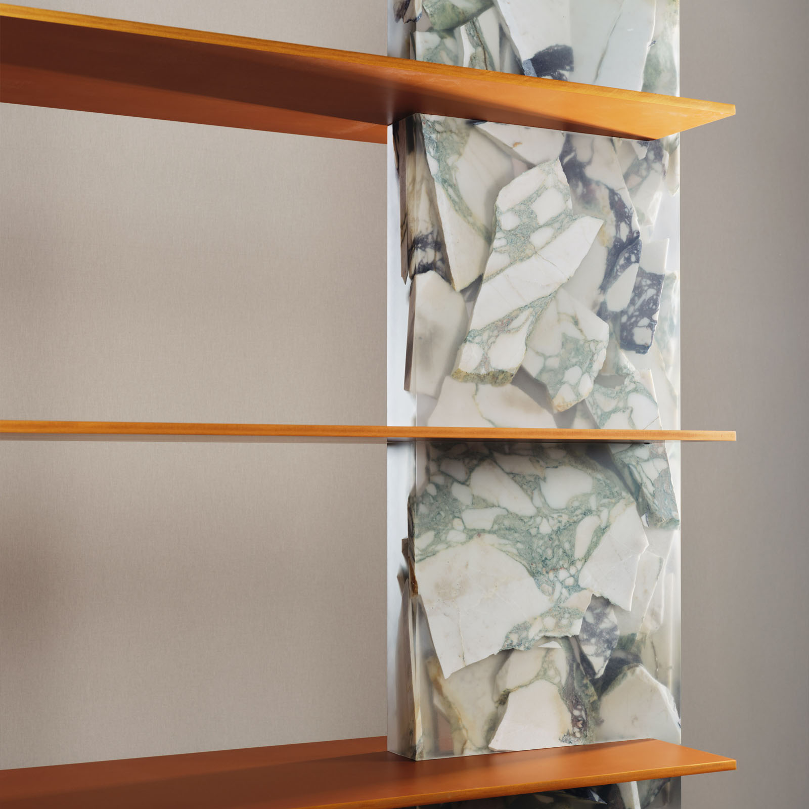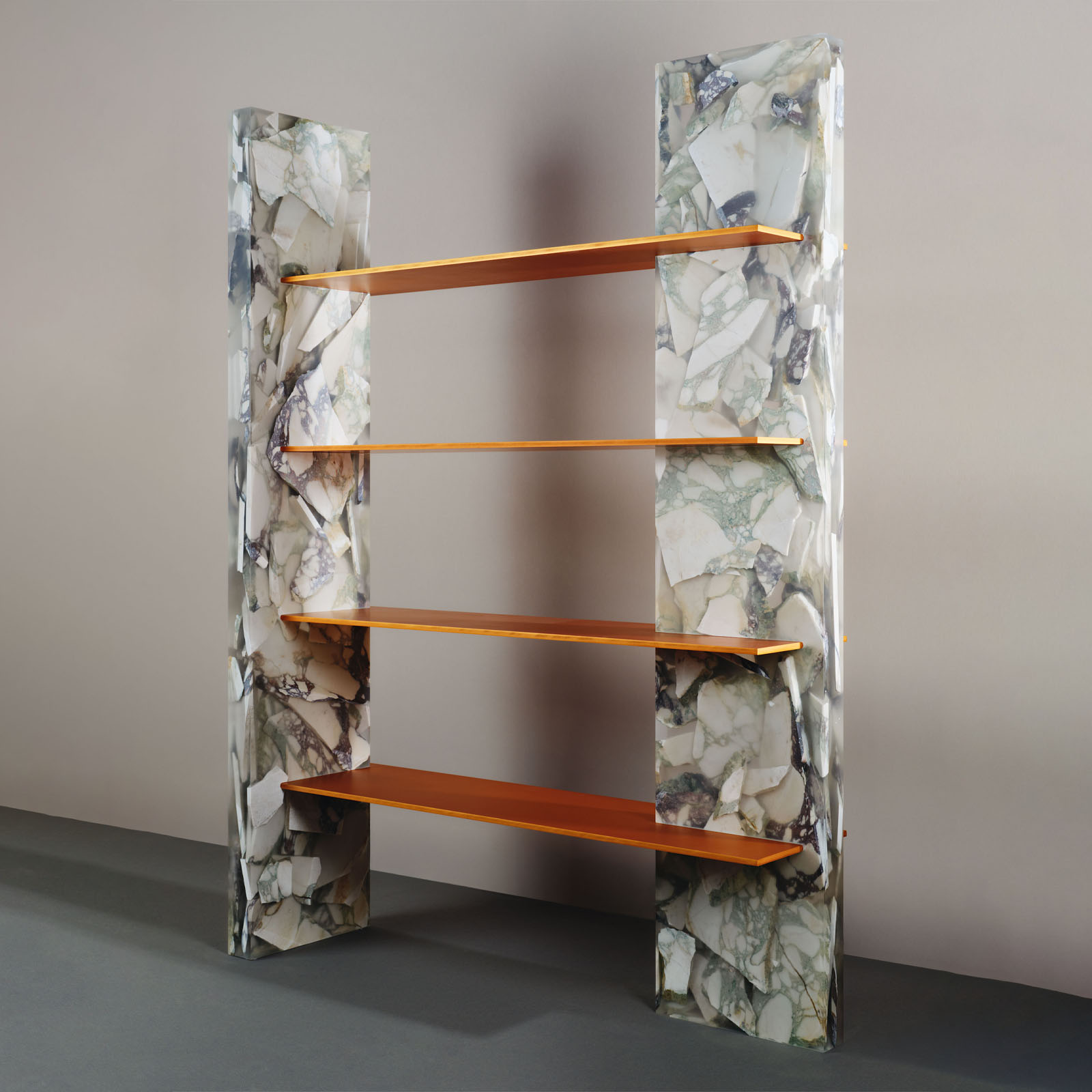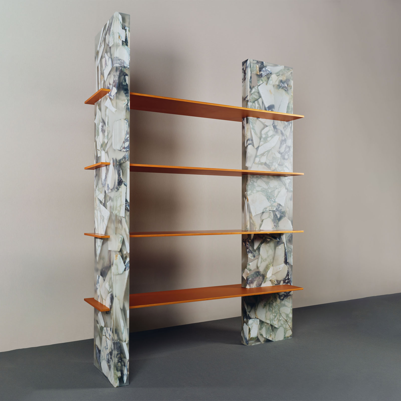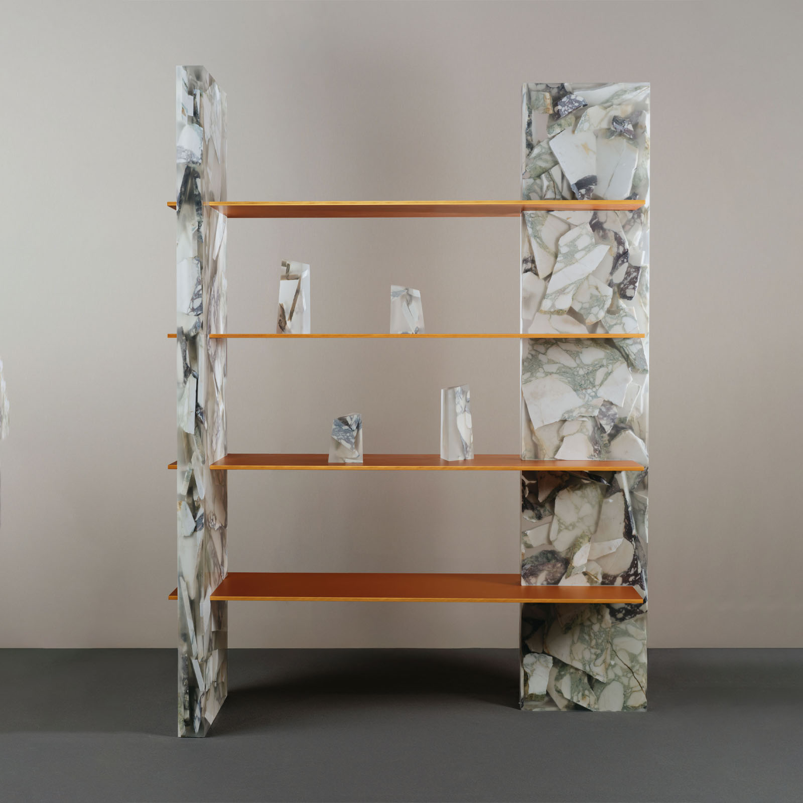 As part of REMAINS – A modular shelving system created with marble fragments bound by resin, creating a layered composite material that showcases a 3D ‘terrazzo’ effect. This hybrid material, featuring interwoven marble pieces is combined with lightweight anodised aluminum. Colours and dimensions customisable based on found marble waste.