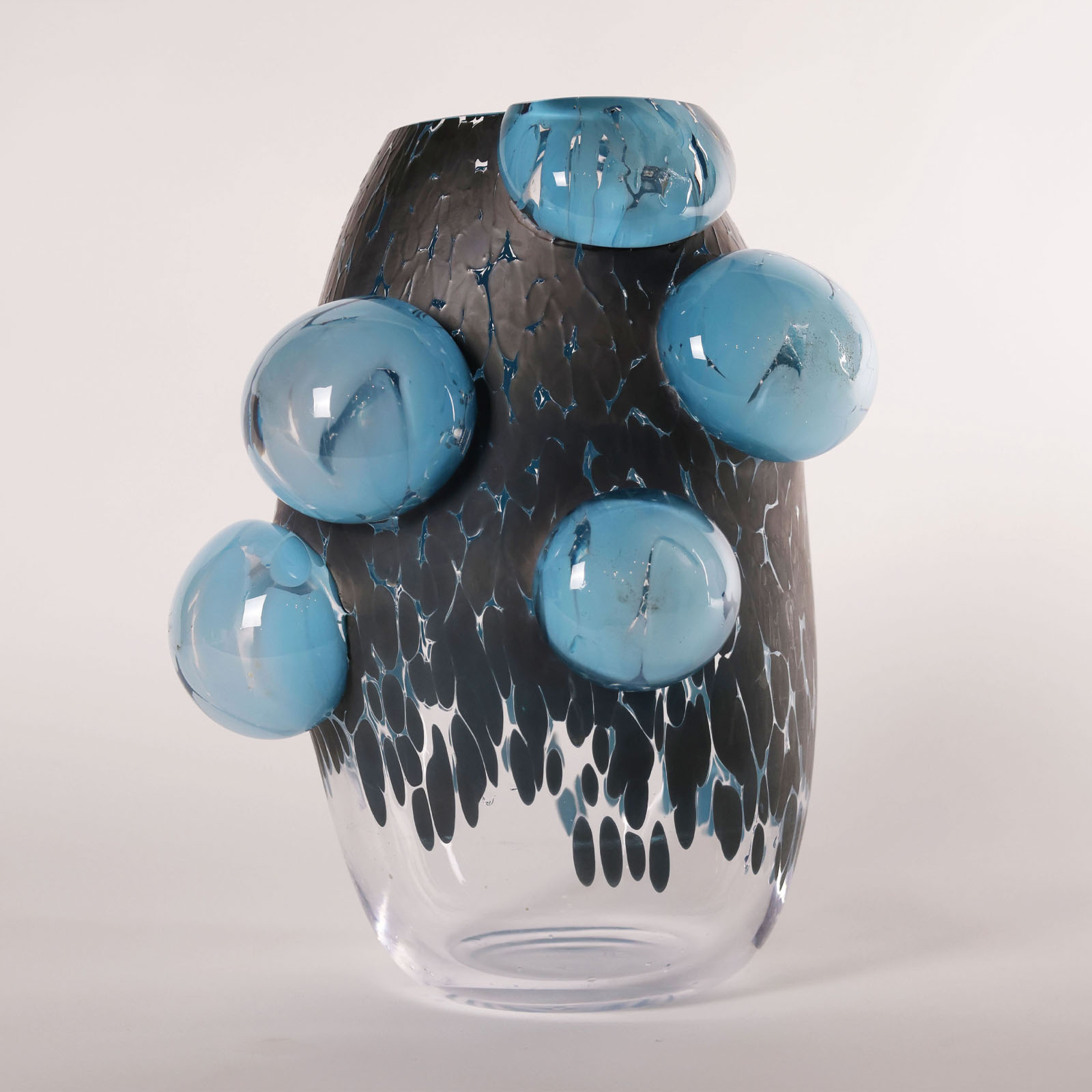 Oxydis emerged from the instability of copper pigment, behaving unexpectedly in the fire. Starting with copper’s original blue shade, surfaces exposed to fire transform into metallic reflections. Meanwhile, areas protected by clear crystal preserve its vibrant blue. In Oxydis, material shifts beyond intention, resulting in dynamic, unstable surfaces sculpted by heat and light.