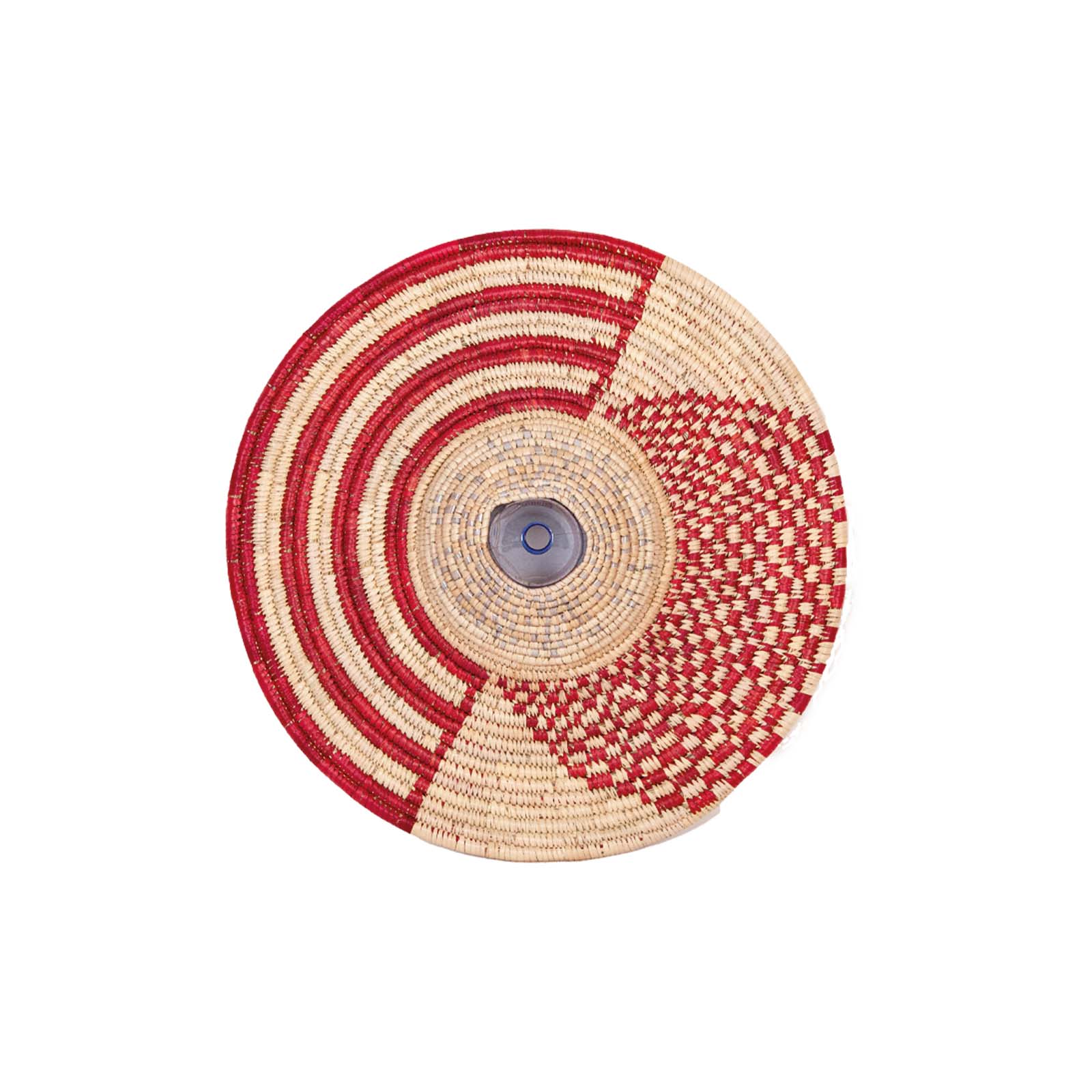 For this collection the artisans use a traditional basketry technique that translates as “coiled”; weaving the palm leaves that form the structure with the translucent strands of the plastic PET bottle. This creates a wide, flat lampshade, whose robust form is decorated in incredible patterns, freely chosen by the artisan as a reflection of the cosmogony of their local culture.