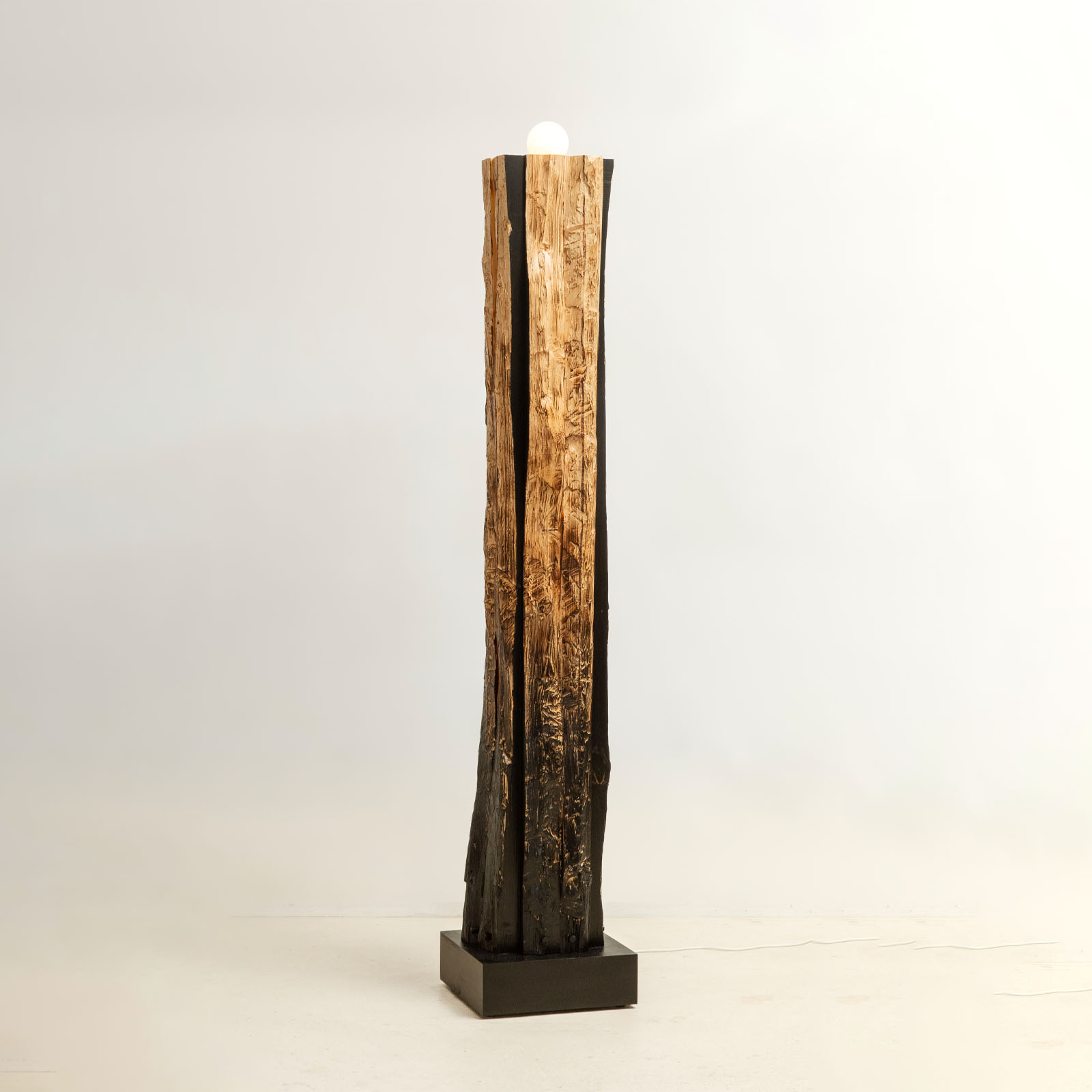 The lamp was made from a 10×10 cm construction beam that had split along its natural crack. It was treated with charring and inking to enhance its natural split texture and the carved markings. The inked marks resemble the elements that can be found in Chinese ink painting.