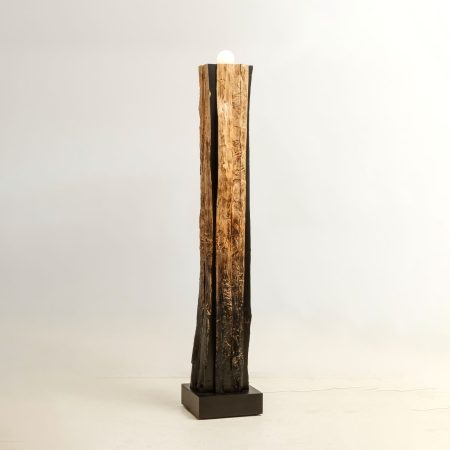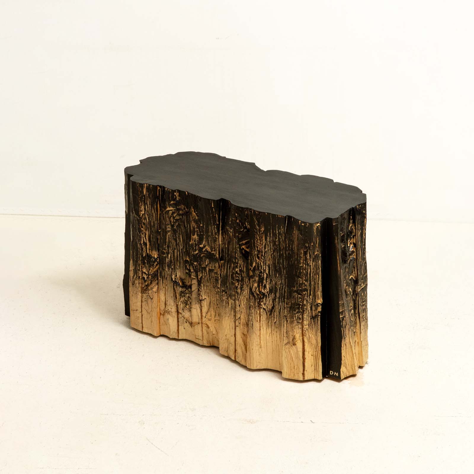 The stool is made from a 10×10 cm construction beam that had split along its natural crack. This split exposes the pith of the wood on the outside. The tactile surface has been charred and inked to highlight the natural textures and carving marks, resembling elements found in Chinese ink painting.