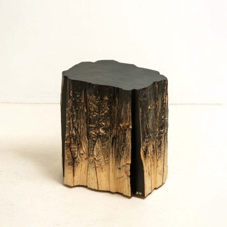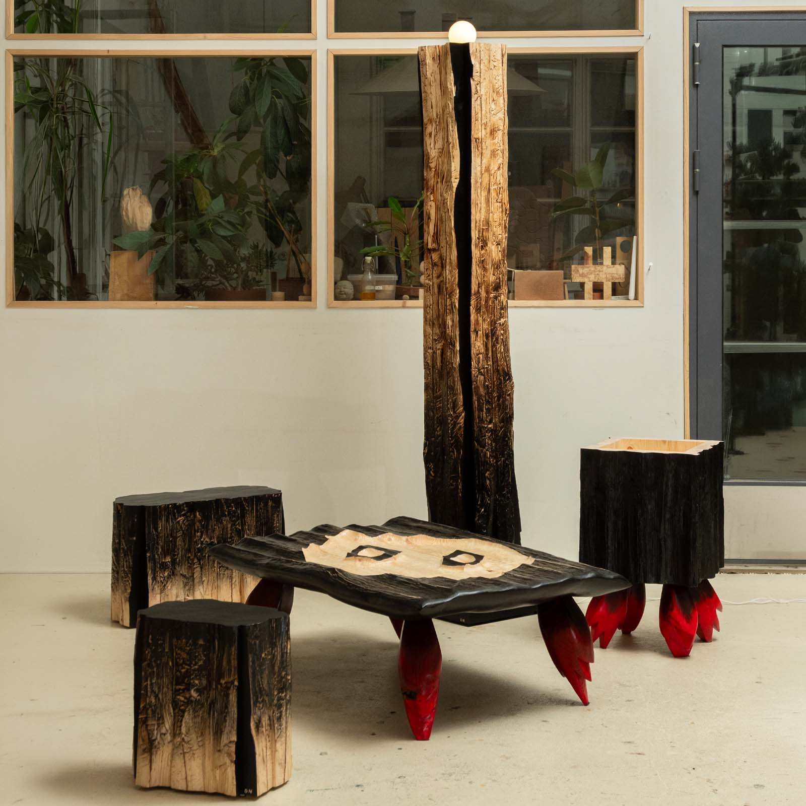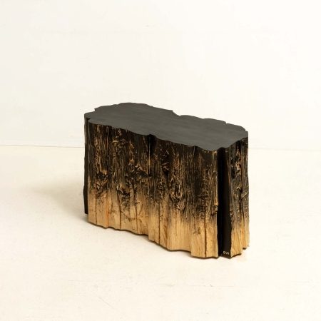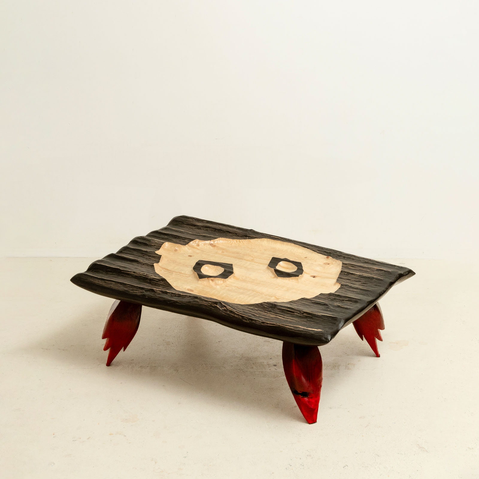 The coffee table was crafted from a 10×10 cm construction beam that had split along its natural crack. The center of the table is hand-carved into various graphical shapes. It features two small bowls designed for holding fruits or nuts. The four feet of the table are sculpted and painted with ink, adding a touch of humour to the overall design.