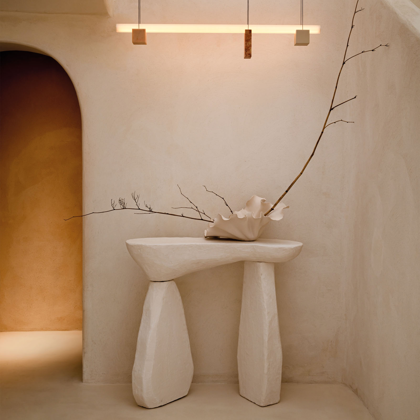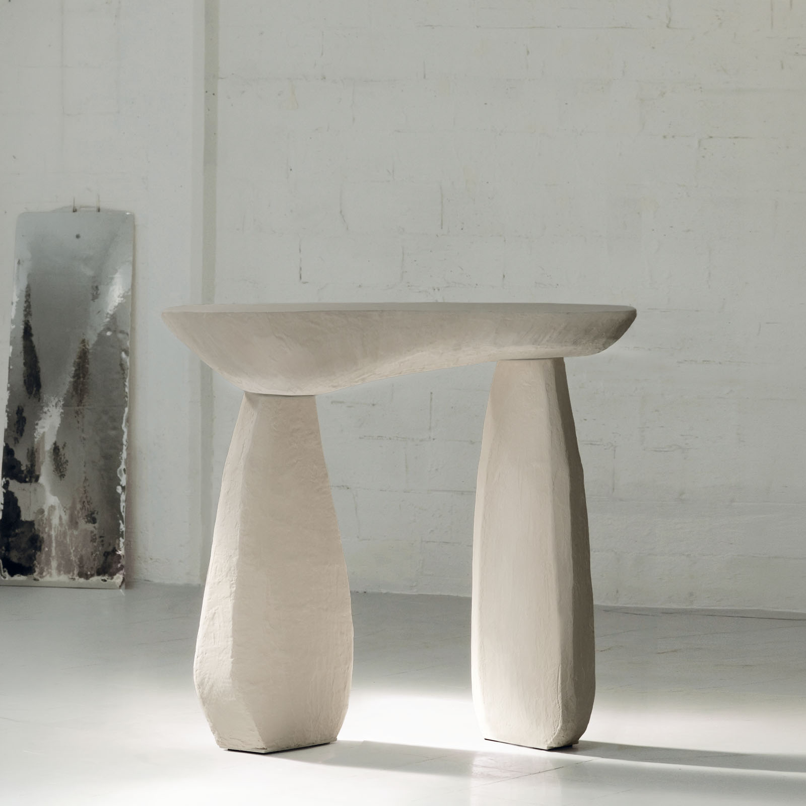 Each console in this series is shaped through a slow, intuitive process of layering materials, without the use of molds, making every piece truly one of a kind. Built from a blend of acrylic resin, fibers, cement, and other structural elements, the forms emerge organically, resulting in subtle variations in shape and texture. This approach gives rise to a diverse family of consoles, where no two are ever alike, yet all share the same sculptural presence and durability. Inspired by natural textures, like sea-sculpted rocks. The carved edges capture sunlight, creating a unique light effect. Each handmade piece is unique and changes appearance with its surroundings.