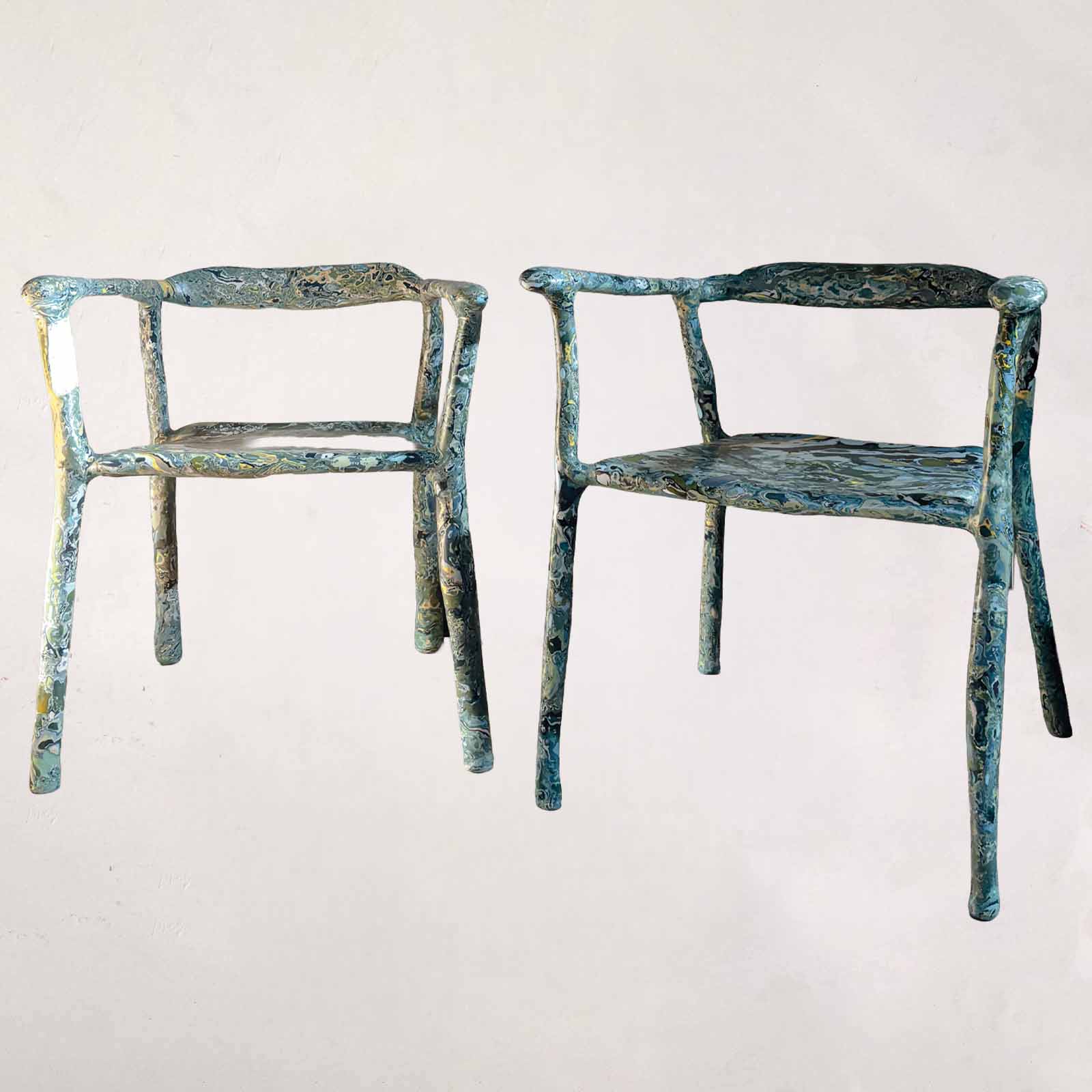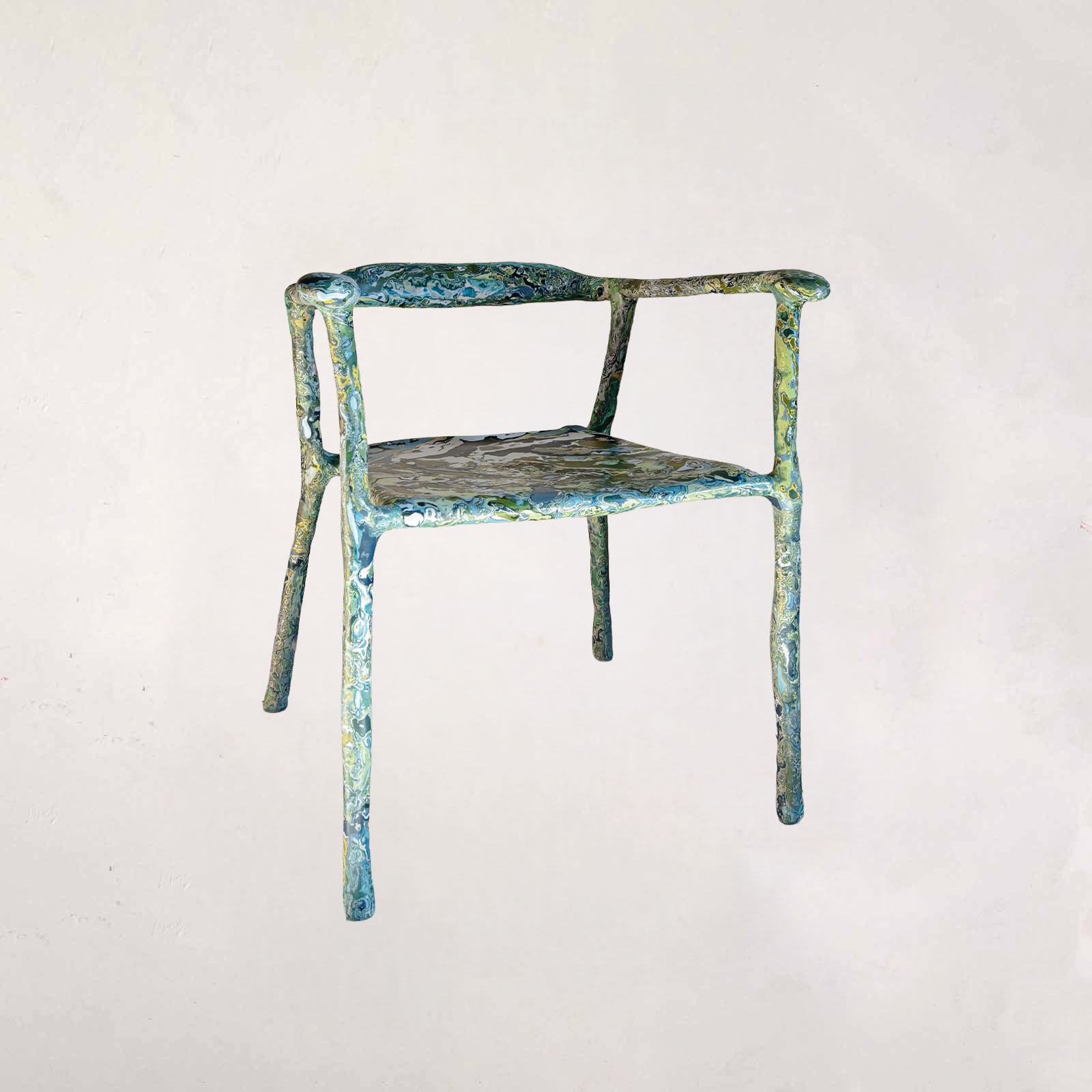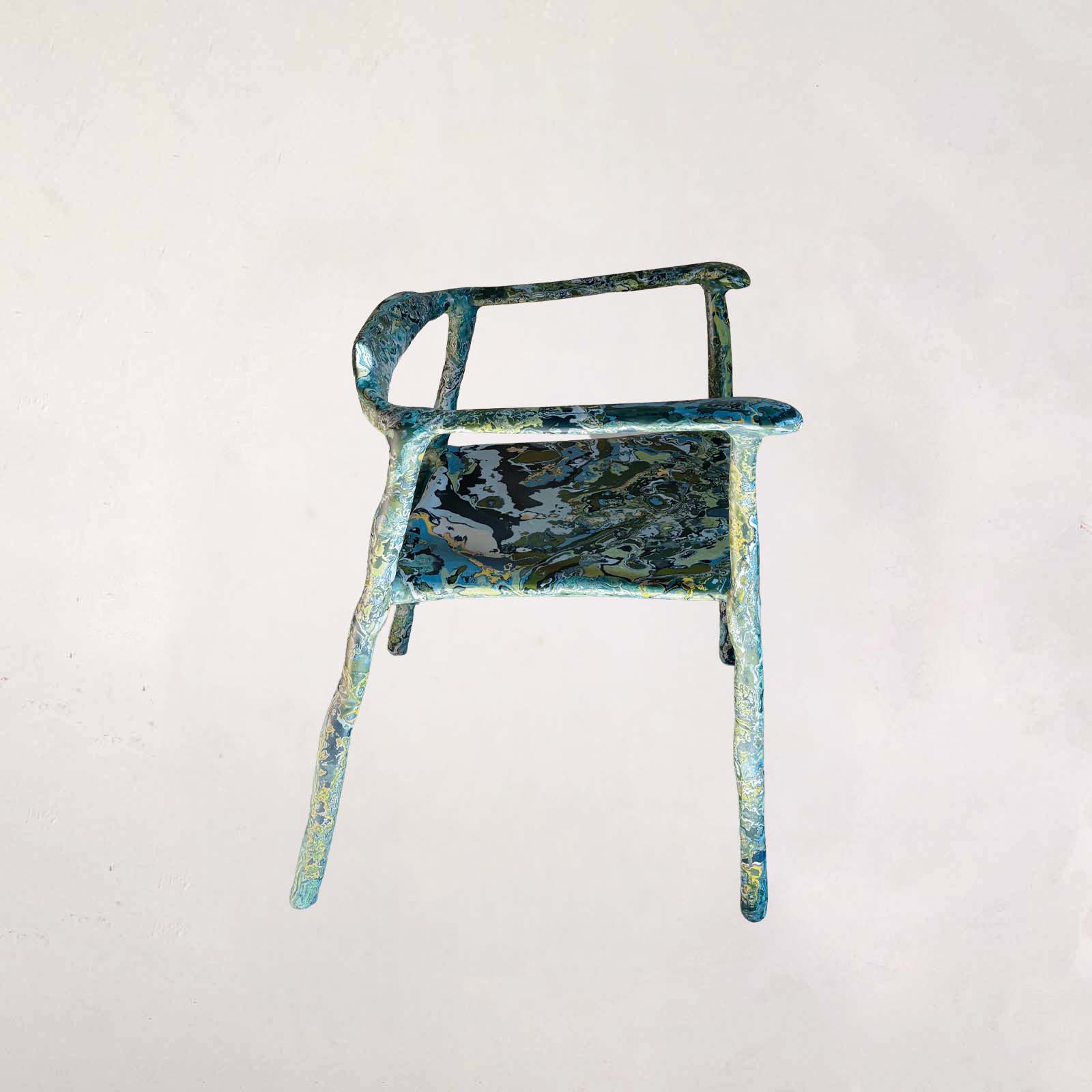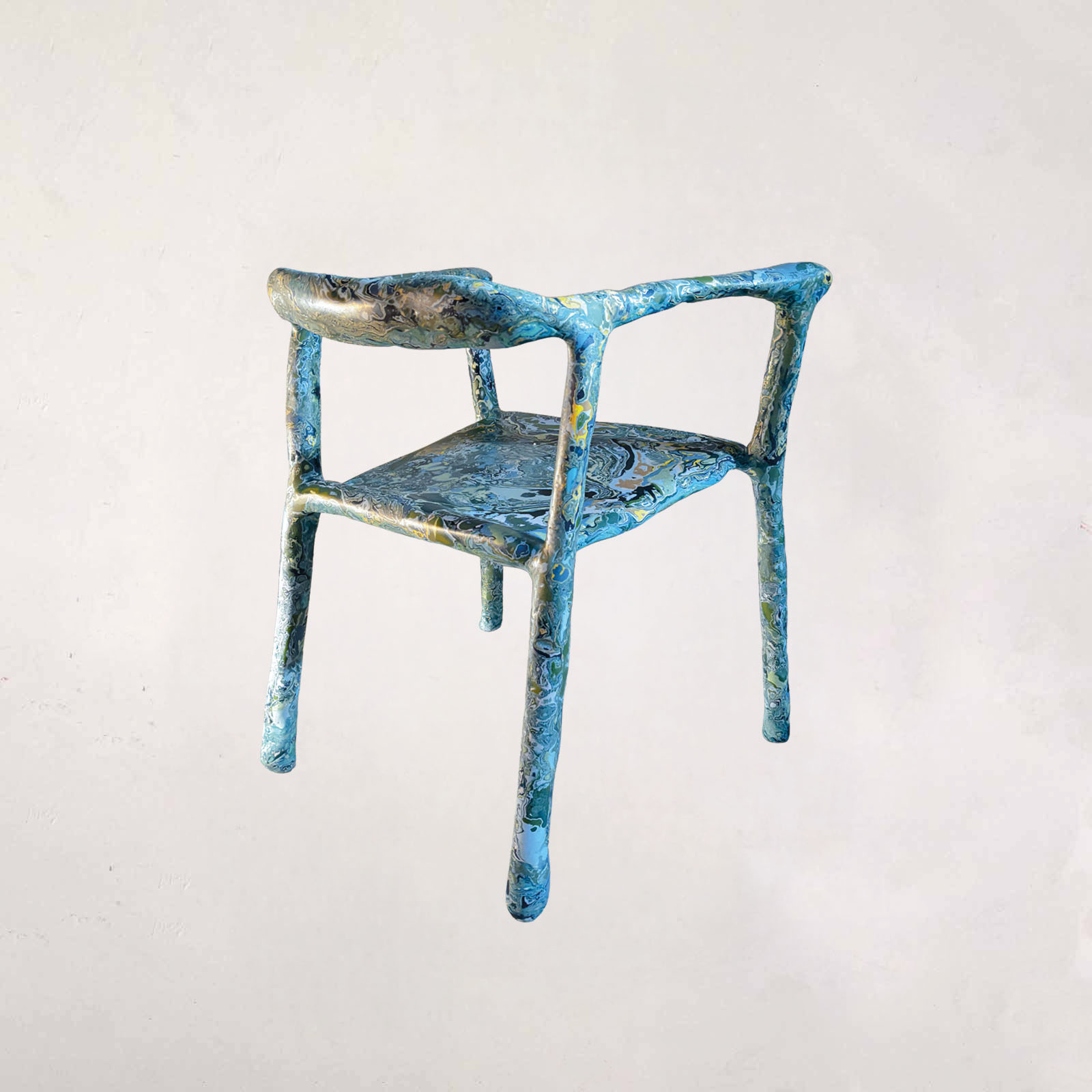 For this new series of Sculpt Chairs, developed for Milan Design Week 2026, the work moves away from resolution and toward continuous transformation. Where earlier pieces sought to reconcile sculpture and function, these chairs resist closure, existing in a state where structure, surface, and gesture remain in flux. Each chair begins with a steel armature that suggests stability and utility, yet this framework is overtaken by a fluid, marbleized material. Built up, eroded, and reworked by hand, the surface allows chance, gravity, and time to act as collaborators. The material, derived from solidified liquid pigment, retains a memory of its origin, carrying traces of movement and decision within its layers. Rather than directly referencing historical techniques, the work absorbs and transforms them. What emerges is a tension between control and surrender, precision and erosion, object and environment. Function remains present, but no longer dominant. Sitting becomes an encounter. The body engages with a structure that subtly alters perception of balance, sound, and space. The chair does not simply support, it frames an experience. Presented outdoors, the works are exposed to weather and light, allowing their appearance to shift over time. What is shown during Milan Design Week is not a final state, but a moment within an ongoing process.