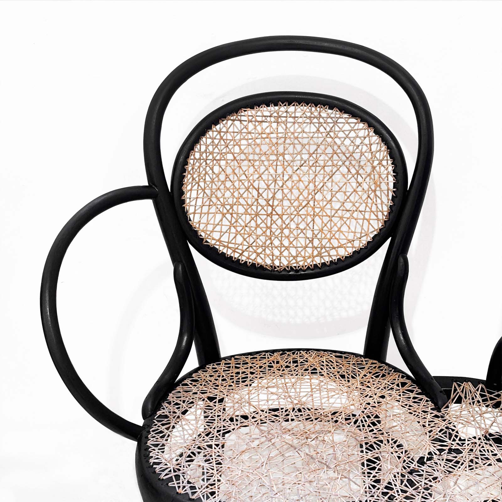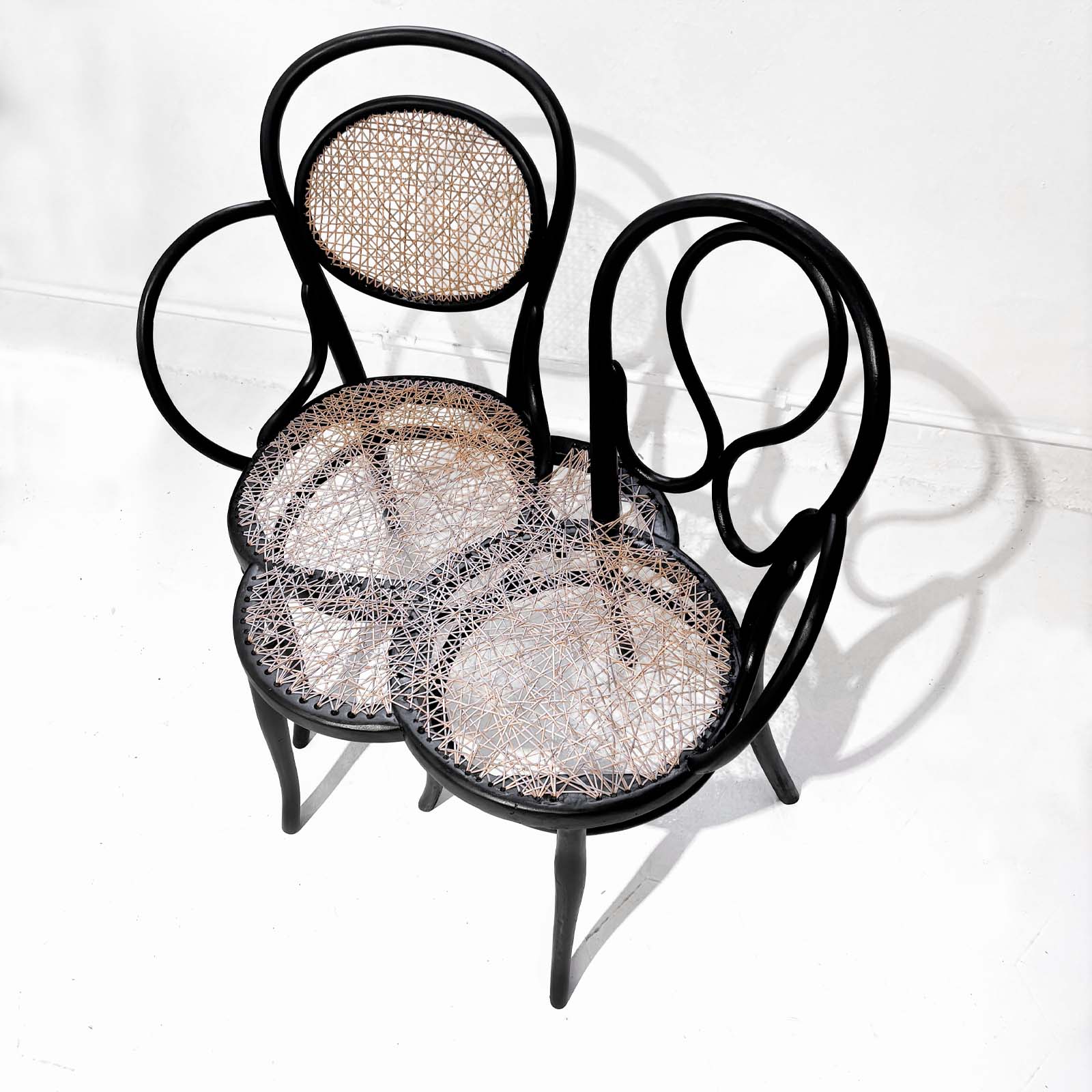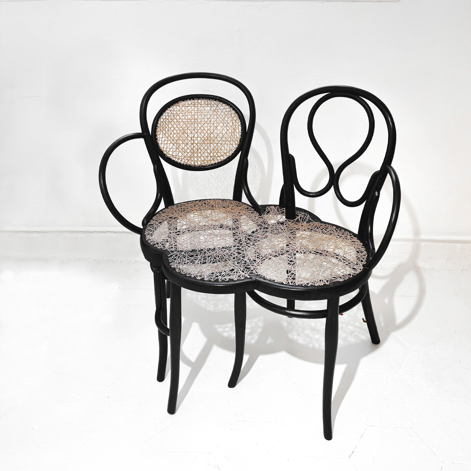 I have always felt a deep connection to Thonet chairs. Their essential design and the remarkable wood-bending technique embody, to me, a perfect balance between aesthetics and craftsmanship. Over the years, I have collected original pieces found in flea markets across Europe, preserving them while waiting to understand their future. Many of these chairs, marked by time, neglect, and sometimes woodworm damage, carried structural fragility but also a powerful expressive presence. My intervention stems from the desire to transform fragility into renewed strength: I remove the irreparably damaged parts and assemble the remaining solid elements together, creating hybrid structures in which the healthy components support one another. The result is a series of small benches and unique seating pieces. Each form is unrepeatable, shaped by the original material. The Vienna straw, entirely handwoven, completes the work, restoring dignity and new life to objects that bear the marks of time
