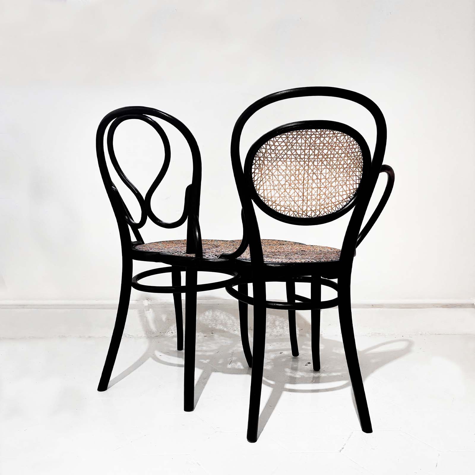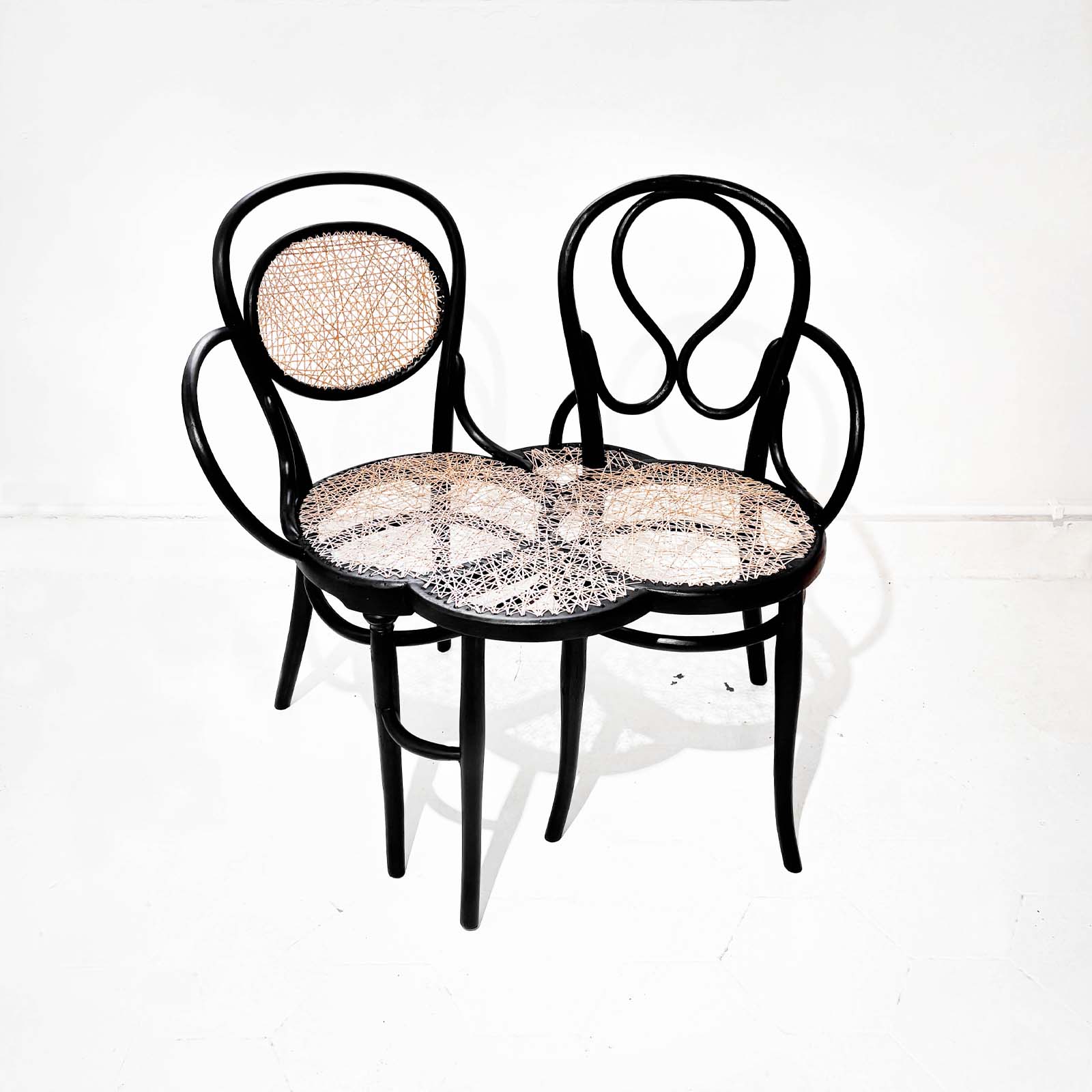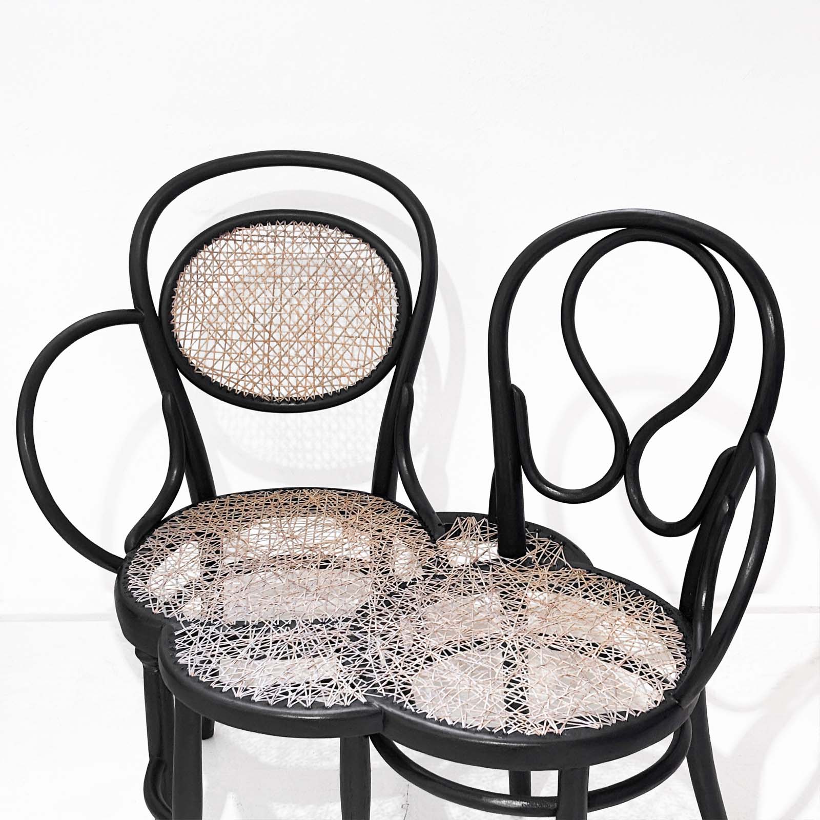 I have always felt a deep connection to Thonet chairs. Their essential design and the remarkable wood-bending technique embody, to me, a perfect balance between aesthetics and craftsmanship. Over the years, I have collected original pieces found in flea markets across Europe, preserving them while waiting to understand their future. Many of these chairs, marked by time, neglect, and sometimes woodworm damage, carried structural fragility but also a powerful expressive presence. My intervention stems from the desire to transform fragility into renewed strength: I remove the irreparably damaged parts and assemble the remaining solid elements together, creating hybrid structures in which the healthy components support one another. The result is a series of small benches and unique seating pieces. Each form is unrepeatable, shaped by the original material. The Vienna straw, entirely handwoven, completes the work, restoring dignity and new life to objects that bear the marks of time