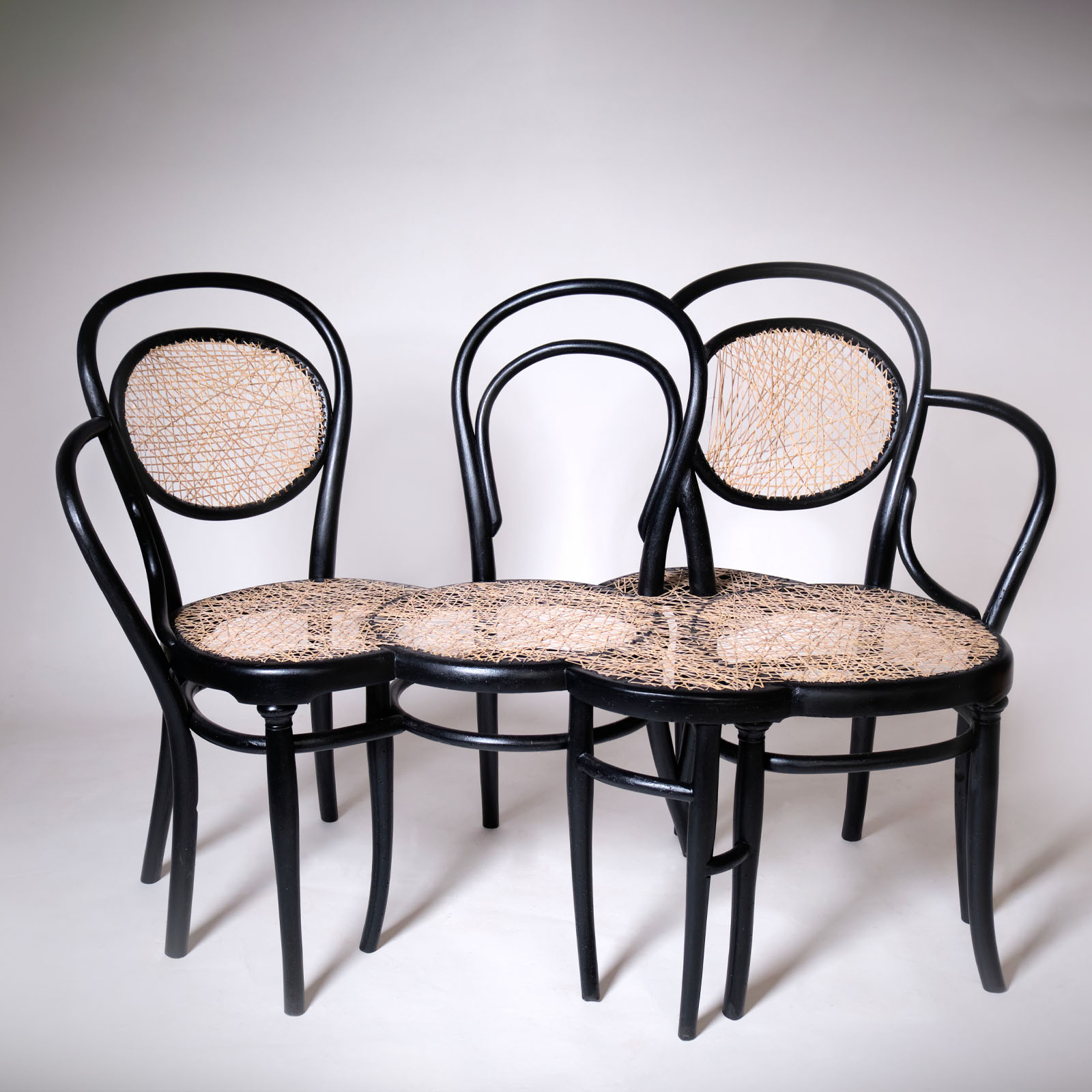 I have always felt a deep connection to Thonet chairs. Their essential design and the remarkable wood-bending technique embody, to me, a perfect balance between aesthetics and craftsmanship. Over the years, I have collected original pieces found in flea markets across Europe, preserving them while waiting to understand their future. Many of these chairs, marked by time, neglect, and sometimes woodworm damage, carried structural fragility but also a powerful expressive presence. My intervention stems from the desire to transform fragility into renewed strength: I remove the irreparably damaged parts and assemble the remaining solid elements together, creating hybrid structures in which the healthy components support one another. The result is a series of small benches and unique seating pieces. Each form is unrepeatable, shaped by the original material. The Vienna straw, entirely handwoven, completes the work, restoring dignity and new life to objects that bear the marks of time.